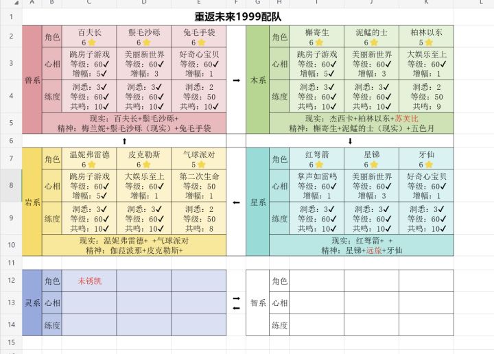 浅色部分就是我当前使用的,每个表格最底下就是当前纯色现实,精神两队的组合,因为走的是优先拉满四系纯色各一队,节约资源及让深眠不用凹,因此可能部分搭配没有很合适