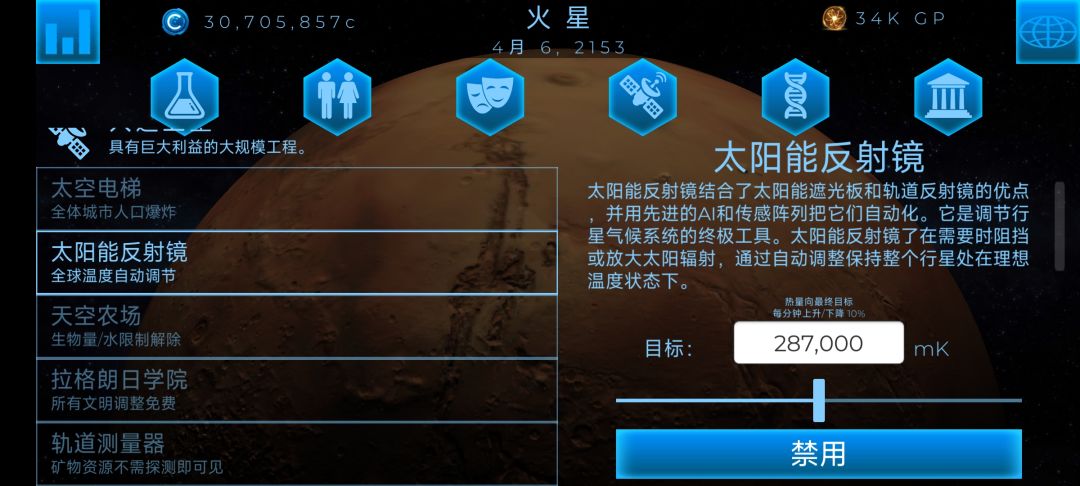 有了太空港后就会解锁卫星,在卫星里尽量多的研究那些设施,比较花大价钱建的没有坏处。主要研究太阳能反射镜,太阳能反射镜可以自动调节星球温度,这样可以节省不必要的开支和麻烦,卫星里还有几个有用的设施我就不一一说明了,主要卫星里还有太空电梯,建设后人口可以突破居住限制