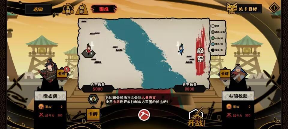 操作形式很简单:还是不用任何卡牌,等到敌方将我方打到溃逃后,正常移动可以看到敌方仍在水中,在戳到敌方同时释放青鸟旋风,将敌方军队一直吹在水中,这时可以使用第二张卡牌移动,令枪兵再次形成枪阵,再戳水中敌军,最后使用恢复,玩家们静静等待三星胜利即可。