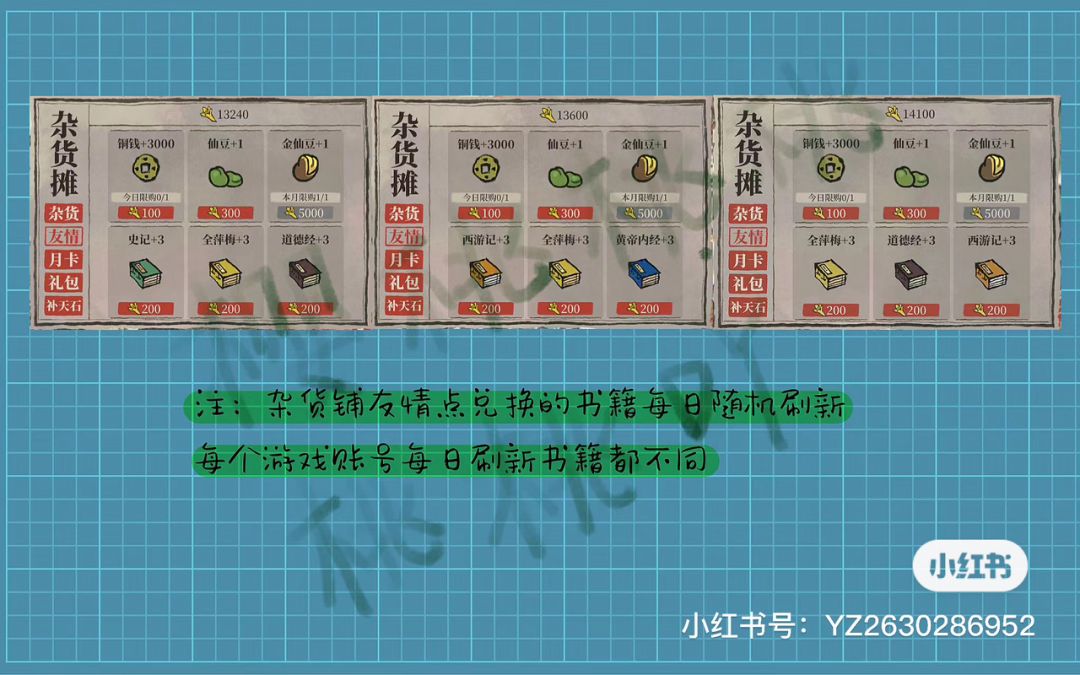 书籍获取:每天可以通过书局、友情点和土地公获取,还有一些完成任务可以获得书籍的地方,包括非日常任务、星宿和探险。