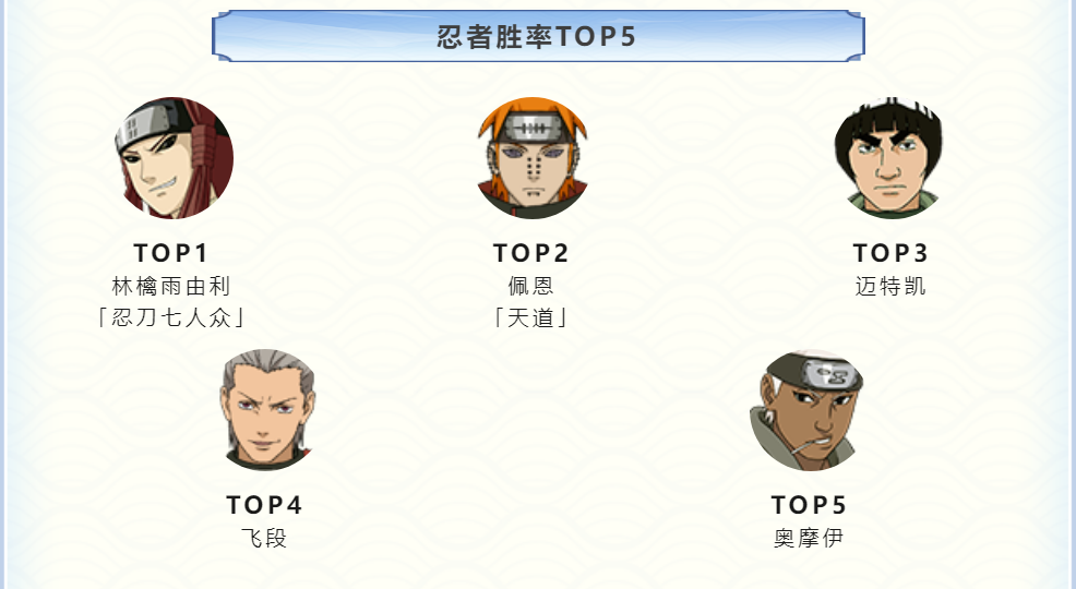 胜率方面,林檎雨由利以优秀的伤害获得胜率第一。天道佩恩依靠高爆发直接拿下胜率榜第二。迈特凯作为第一位A忍,证明了什么叫“姜还是老的辣”。飞段的技能范围优势让对手往往措手不及。奥摩伊实战中功能多样的一技能使其也榜上有名。武斗赛忍者数据回顾看完无差别的忍者数据,再来看武斗赛的忍者数据吧!在通灵的加持下,学员们的忍者偏好会迎来怎样的变化?学员们快来看看本次武斗赛的忍者榜单,说不定可以作为决斗场段位赛的阵容参考!
