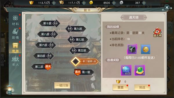 3.爬塔副本共计十层,每层20关。左侧显示层数及玩家所在层数关数,下方显示【重置】按钮。左侧显示玩家通关记录、通关排行榜、排名奖励以及当前关卡通关奖励,下方显示【一键挑战】【开始挑战】按钮,按钮功能与前面副本功能一致,点击【开始挑战】进入通天塔进行挑战。