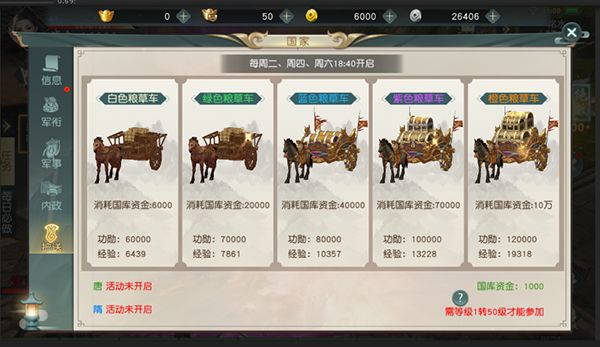 3.开启该活动需消耗国库资金,根据国库资金量,发送最高等级的粮草车,若资金不足,则不发车。
