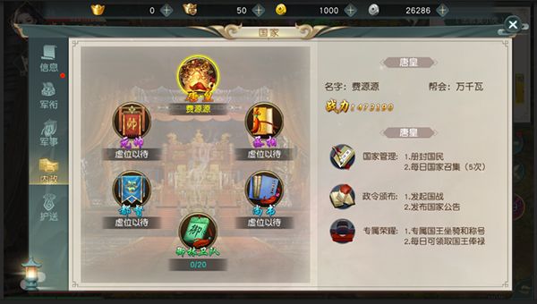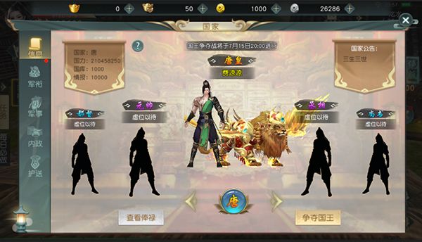 3.内政职位包括:唐皇/隋帝、元帅、丞相、都督、尚书和御林卫队;内政职位除御林卫队(最多可任命20人),其它每个职位最多只能认命1人。