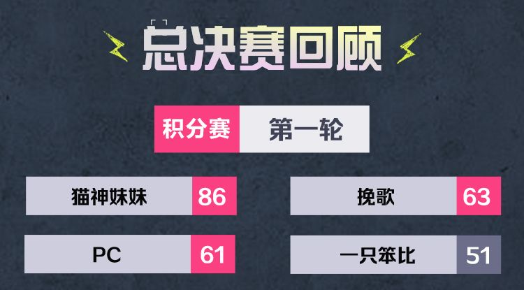 首轮积分定位赛中,4名选手通过混战角逐晋级机会。在这一轮的比赛中,“猫神妹妹”以绝对优势拿下第一名率先晋级最终冠亚军角逐,排名第四的“一只笨比”则遗憾离场。排名第二的“挽歌”和排名第三的“PC”需要通过第二轮来共同竞争最后一个晋级名额,战况如下: