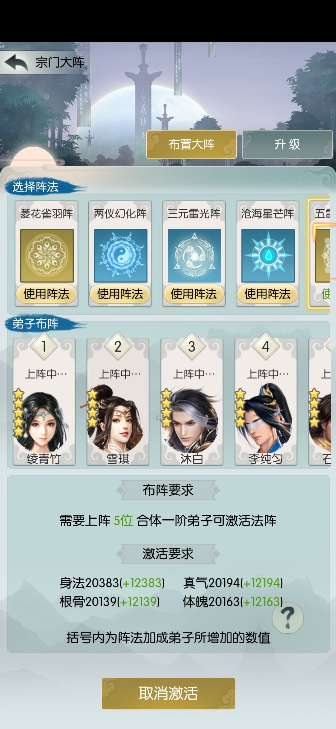 关于阵法:从修仙营地上看属性最好的应该是血影,目前还没有,其次是凌青竹和唐叁,再就是四星的雪琪和李纯均。最后是石天昊,沐白,滕青山等等,也抛开天赋不说,尽量上五星弟子,技能的加成高,所以需要洗髓配合,尽量提高弟子的四维属性。