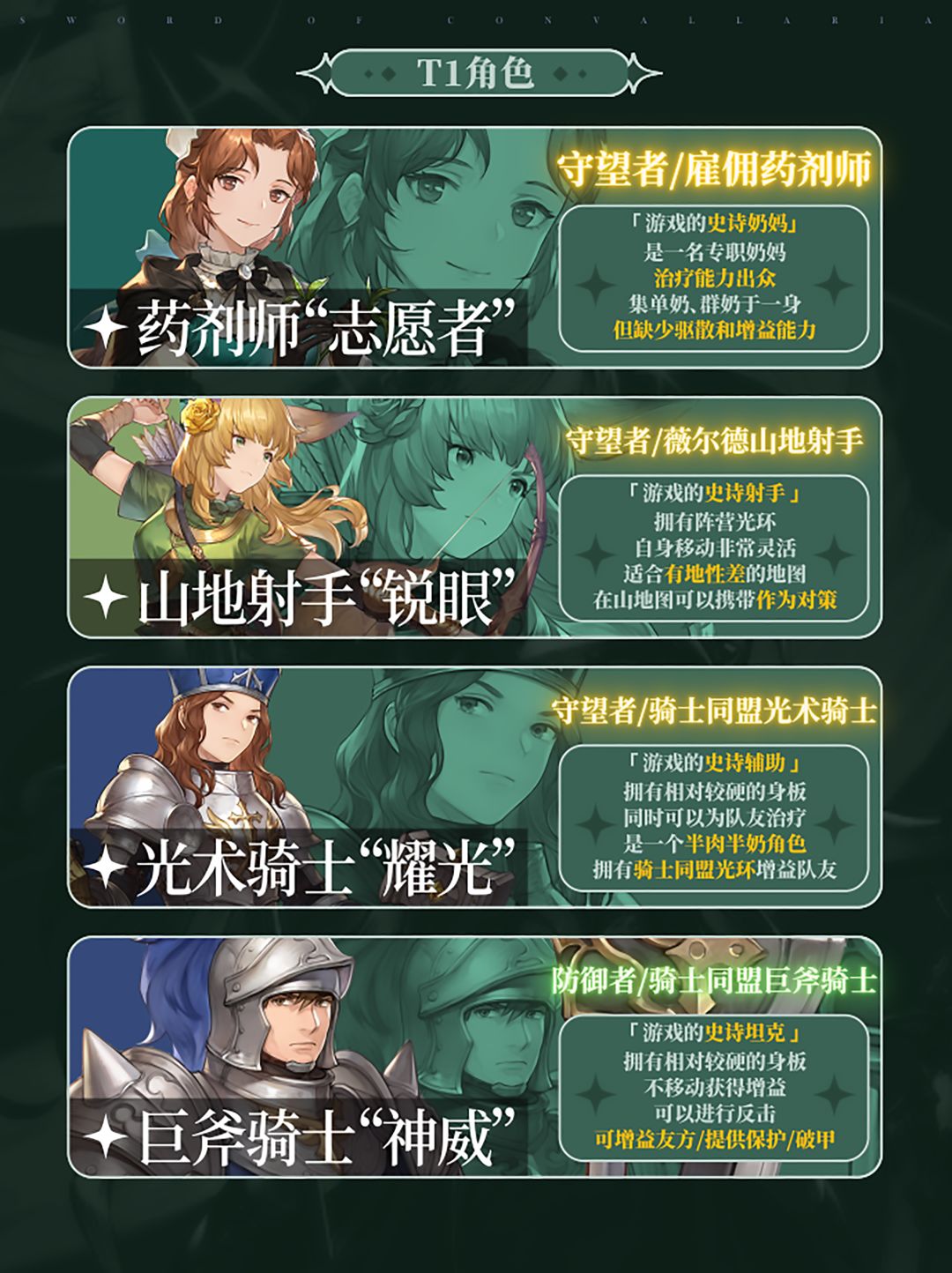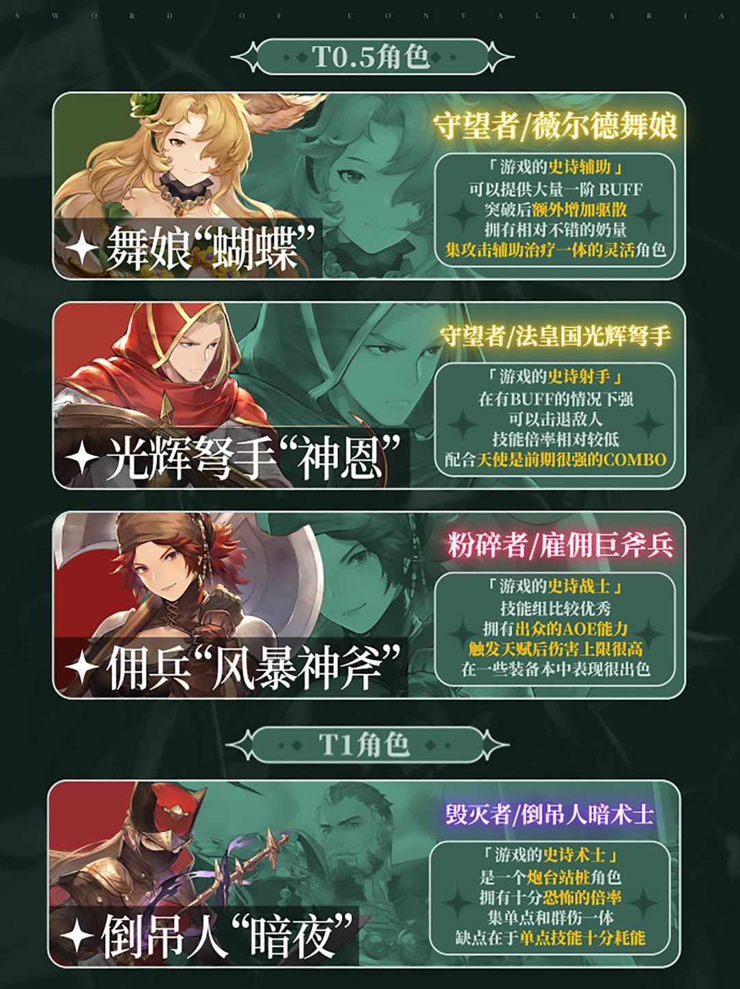 此榜单的排行参考了《铃兰之剑》的台服和国服极心测试的数据。仅限史诗角色,在游戏的前期,推荐优先培养T0、T0.5、T1的角色以获得较好的游戏体验,同时要注意多种职业、阵营角色的搭配以及携带奶妈来维持健康度。本次排行共分有四个梯度:T0、T0.5、T1、T2