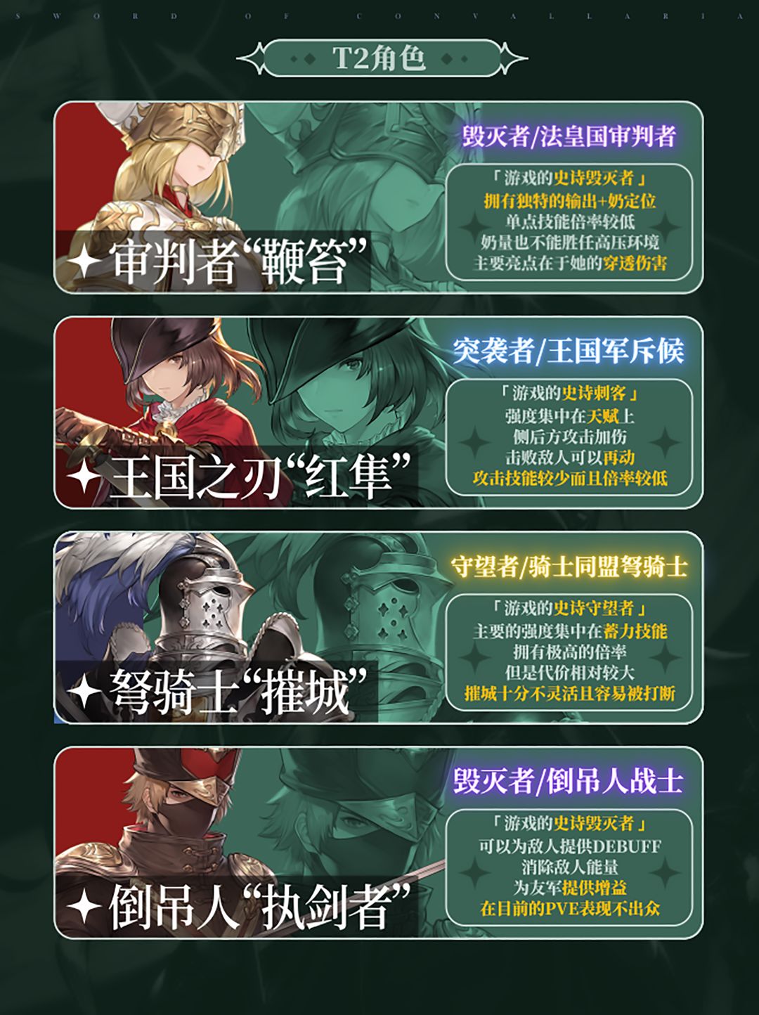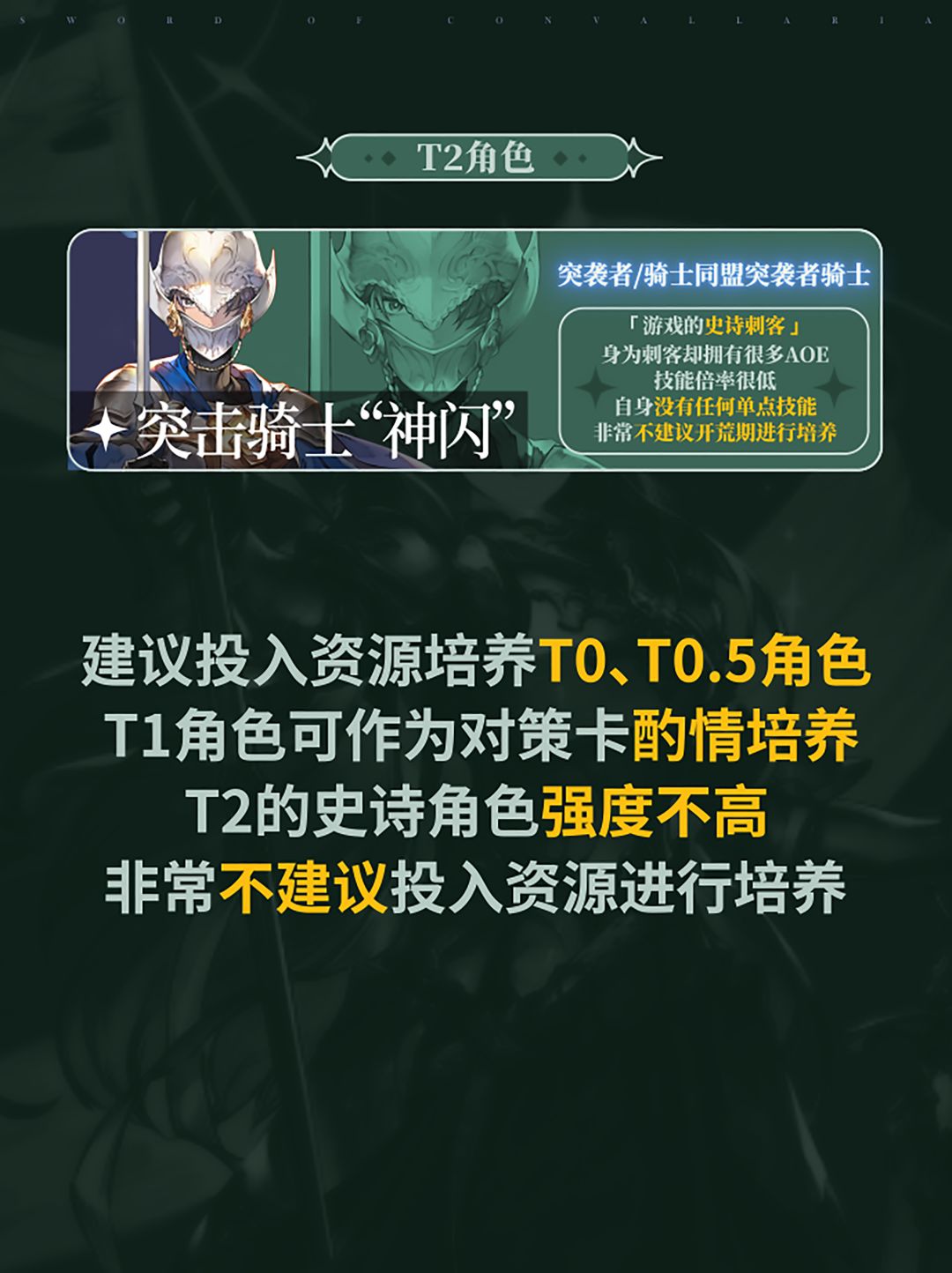 T2角色在当前环境下强度较低,有着较为明显的短板(可能是由数值带来的也可能是由机制带来的),在游戏中这些角色都有比较多的上位替代,非常不建议投入资源进行培养