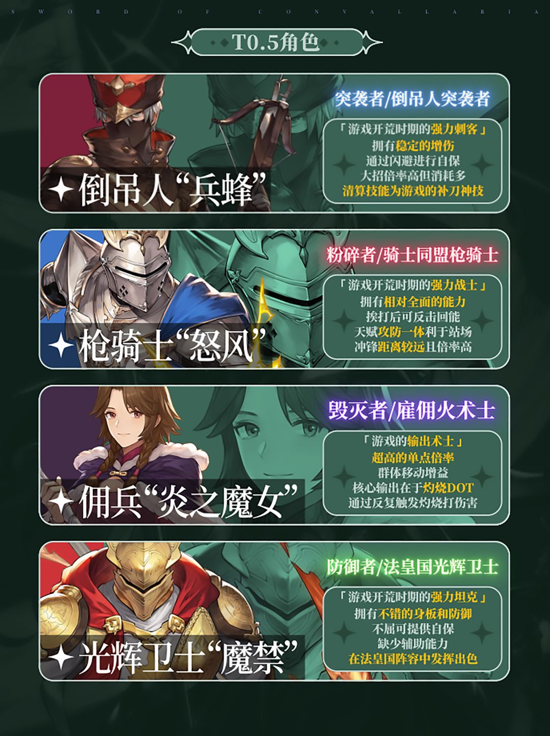 T0.5也有很高的强度,虽然泛用性不如T0角色,但是他们也可以让你的开荒过程变得轻松,比较值得投入资源进行培养,同时T0.5角色也可以与传说角色进行阵容搭配。