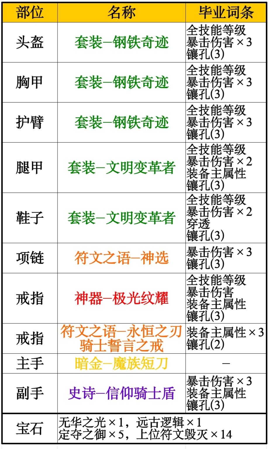 符文之语-永恒之刃:提供大量暴伤和5%双重暴击,词条选择3主属性。胚子推荐骑士誓言之戒,用来缩短盾勇3个主动技能的cd。