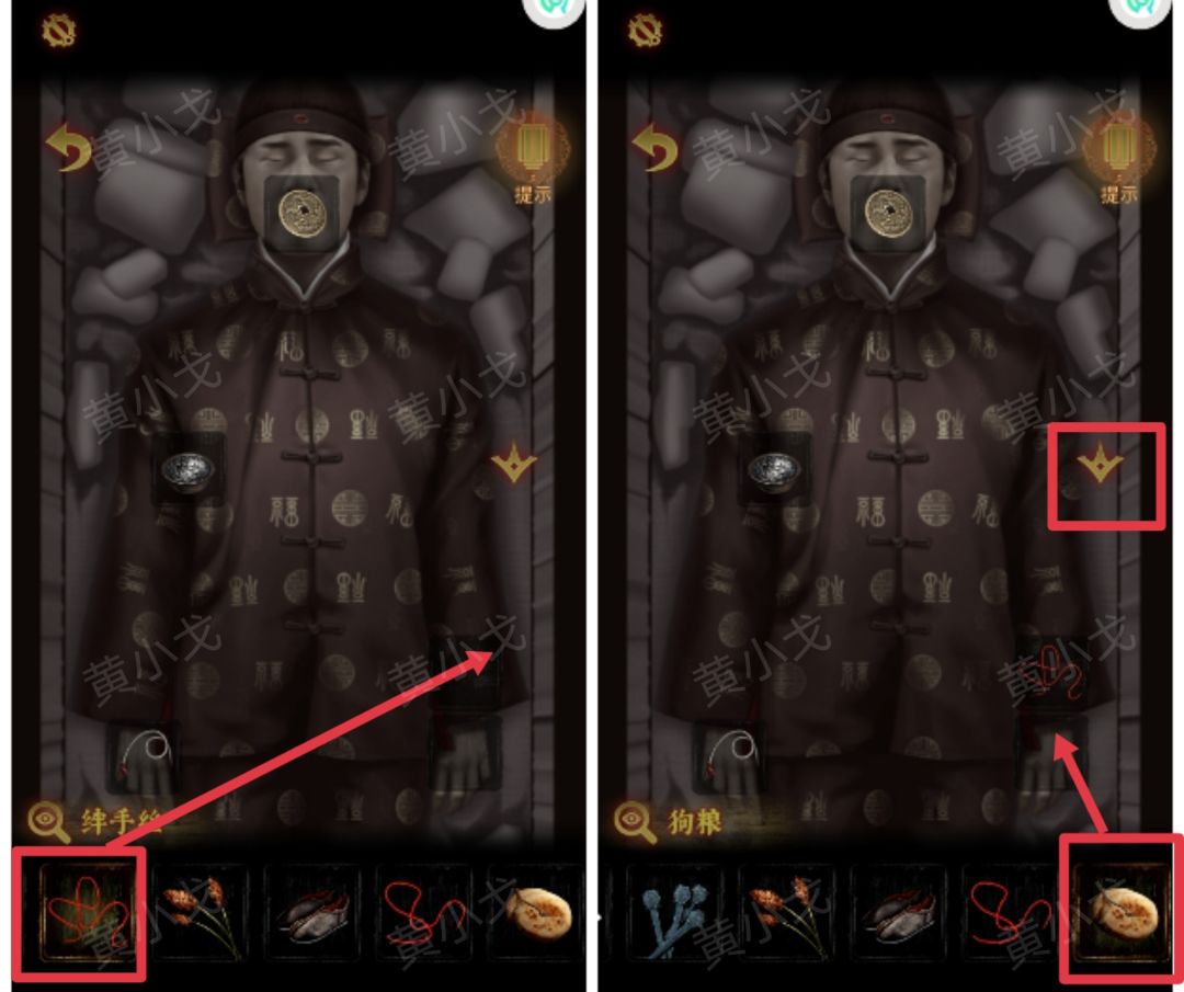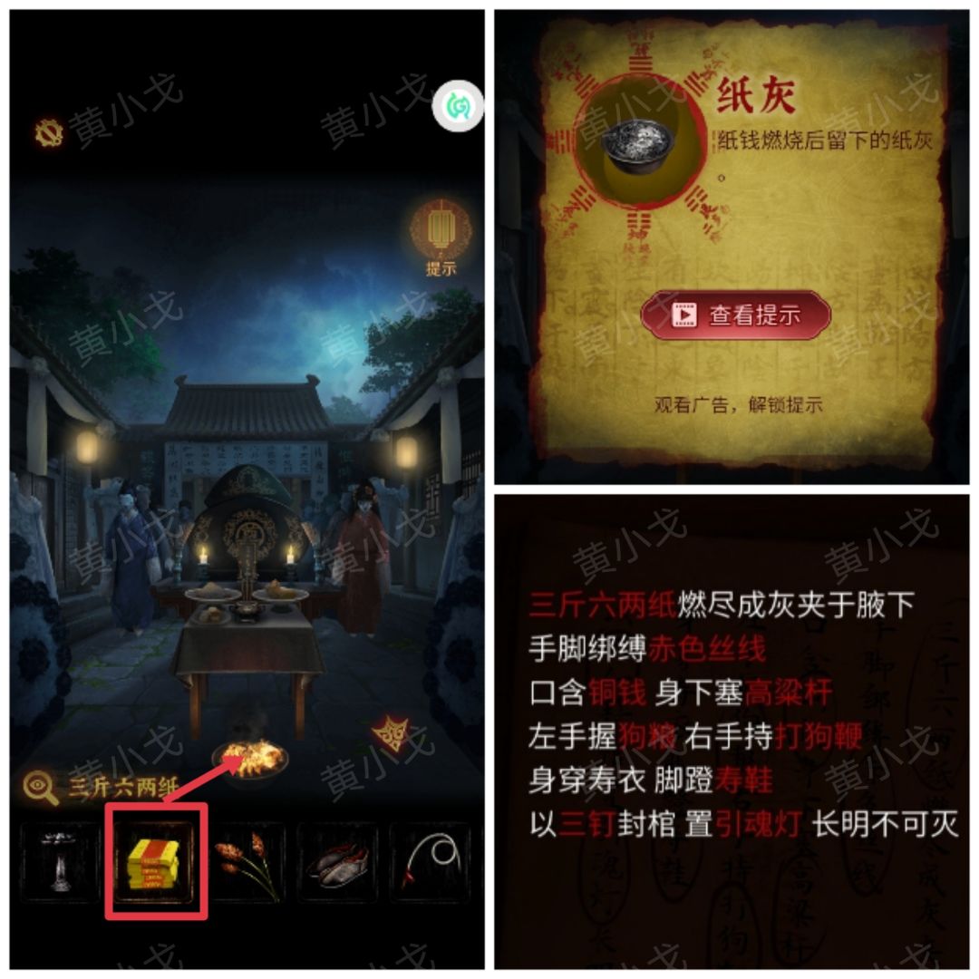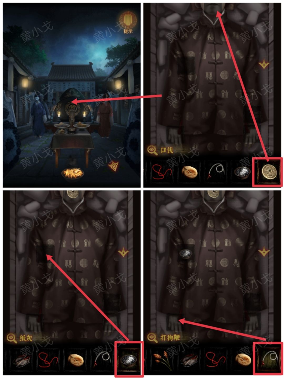 26.点击棺材,根据柜台书上的内容,把【口钱】放入死人嘴巴,【纸灰】放到他腋下,把【打狗鞭】放入右手
