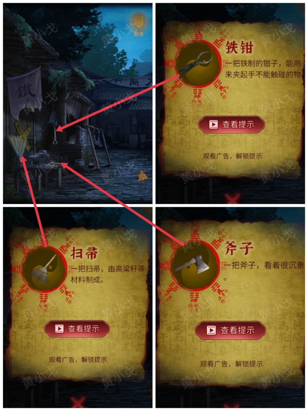 19.点击获取【扫帚】、【铁钳】和【斧子】