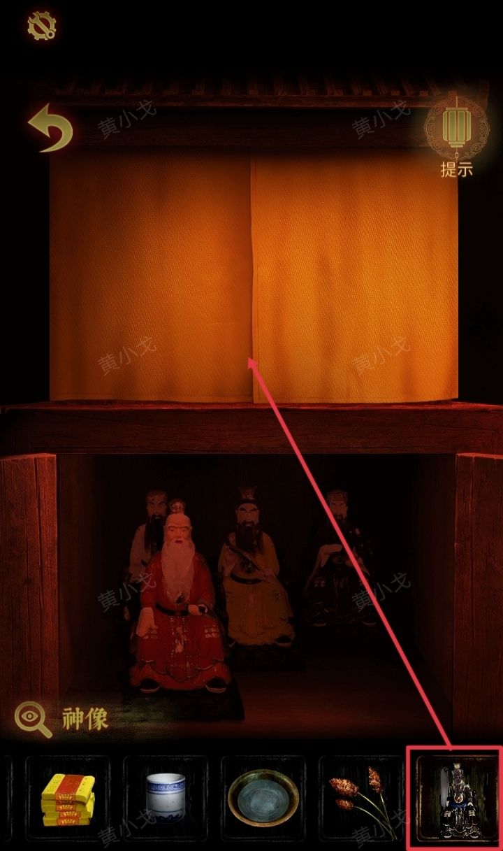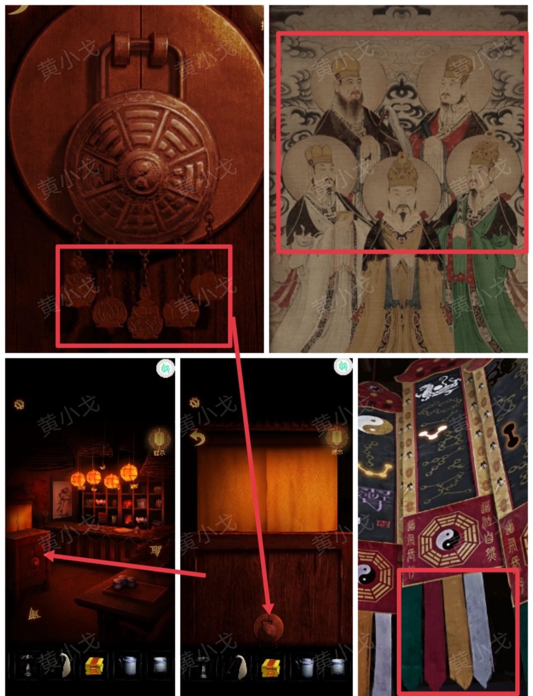 1.(前厅)点击神龛柜门上的锁,根据挂幡上的线索(绿红黄白黑),找到屏风上对应的五斗星君衣服颜色和头冠形状,调整相应头冠的挂链的位置