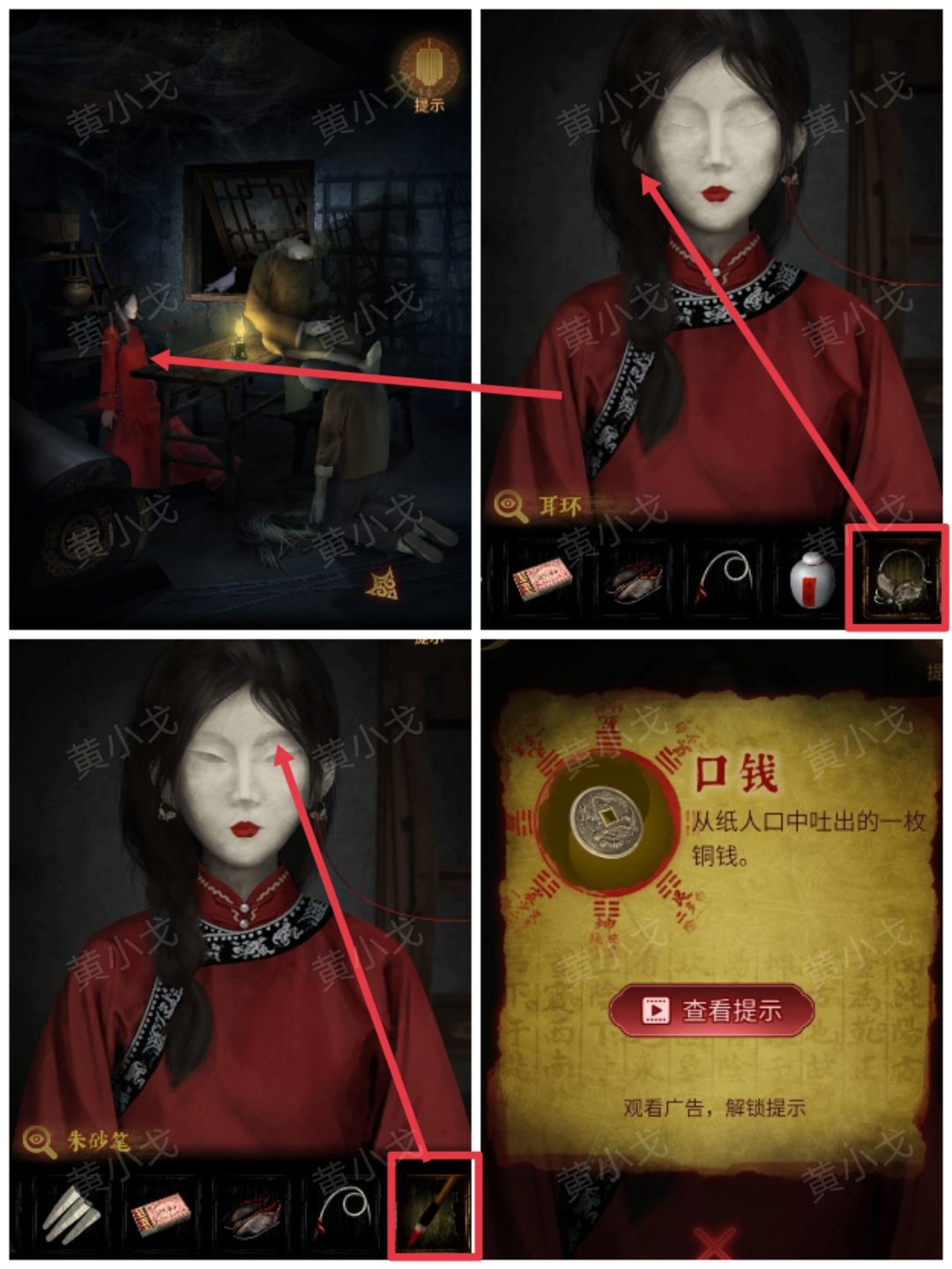 15.(荣二家)点击红色纸人,带她带上【耳环】,用【朱砂笔】给她点睛,获得【口钱】