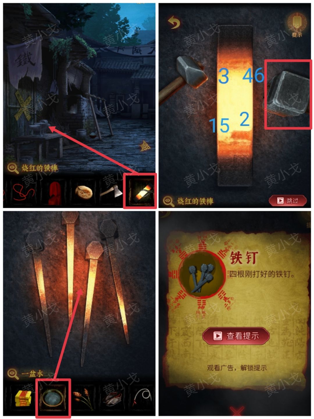 23.把【烧红的铁棒】放上铁砧上,完成小游戏(根据左边锤子自动敲打的顺序和位置,用右边的锤子敲打);倒入【一盆水】淬火,获得【铁钉】