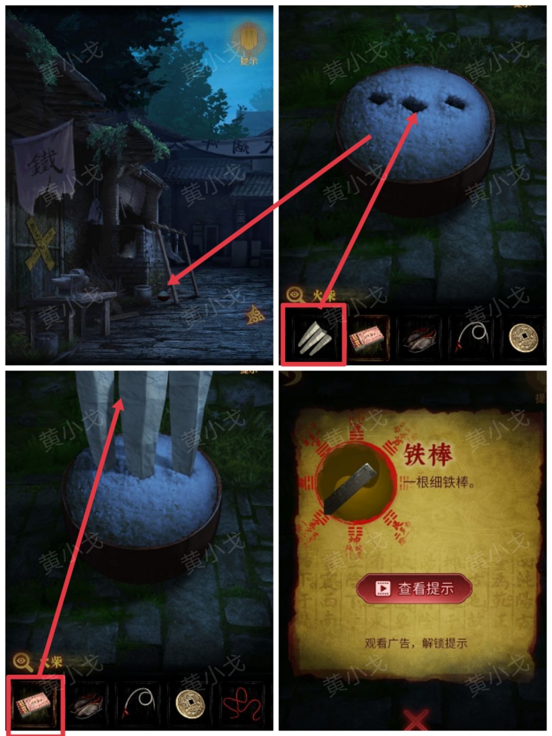 20.点击地上的碗,插入【纸手指】,用【火柴】点燃,获得【铁棒】
