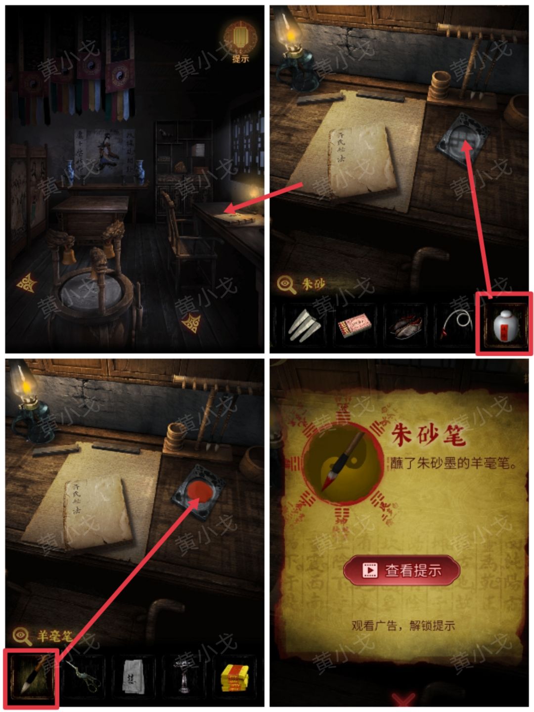 12.点击书桌,把【朱砂】倒入砚台,用【羊毫笔】蘸朱砂,获得【朱砂笔】