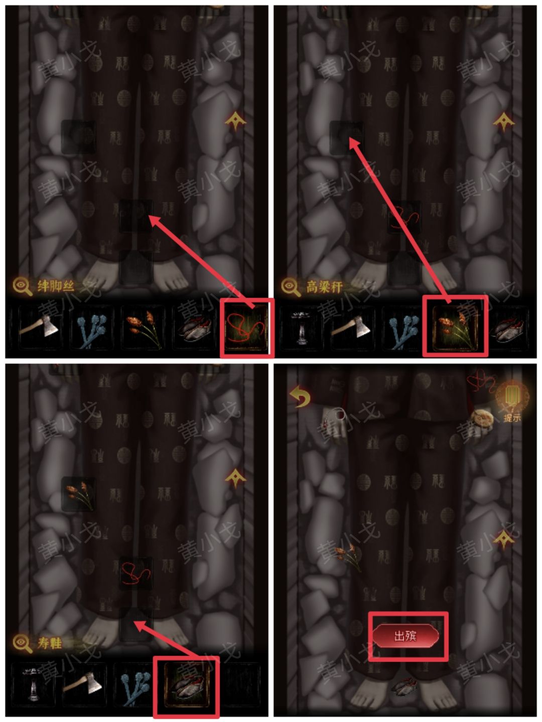 28.绑上【绊脚丝】,【高粱杆】放到他身下,穿上【寿鞋】;点击出殡,触发剧情