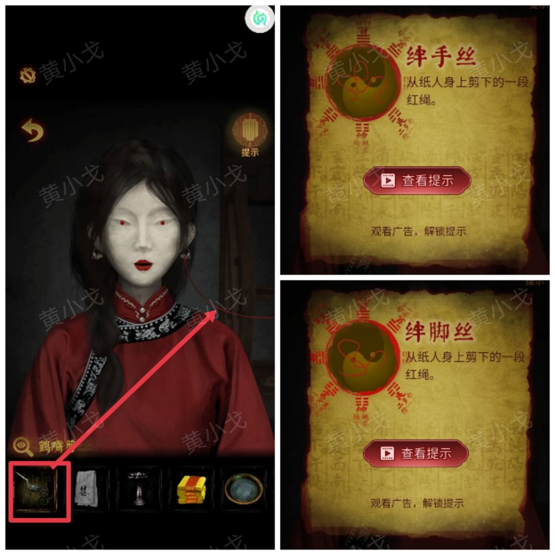 16.用【鹤嘴剪】剪下绑在纸人身上的红绳,获得【绊手丝】和【绊脚丝】