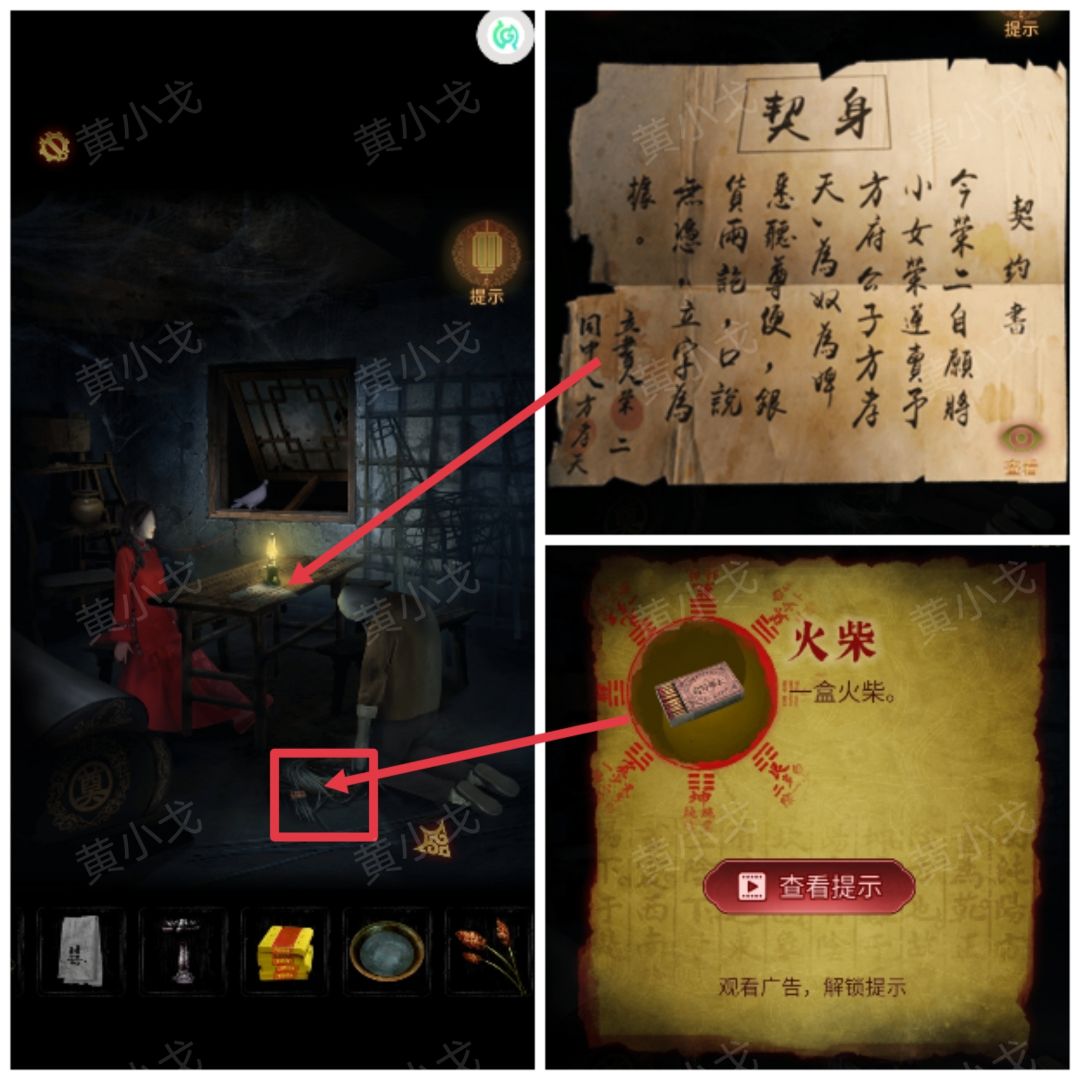 7.(荣二家)点击拾取地上的【火柴】;点击查看桌子上的契书