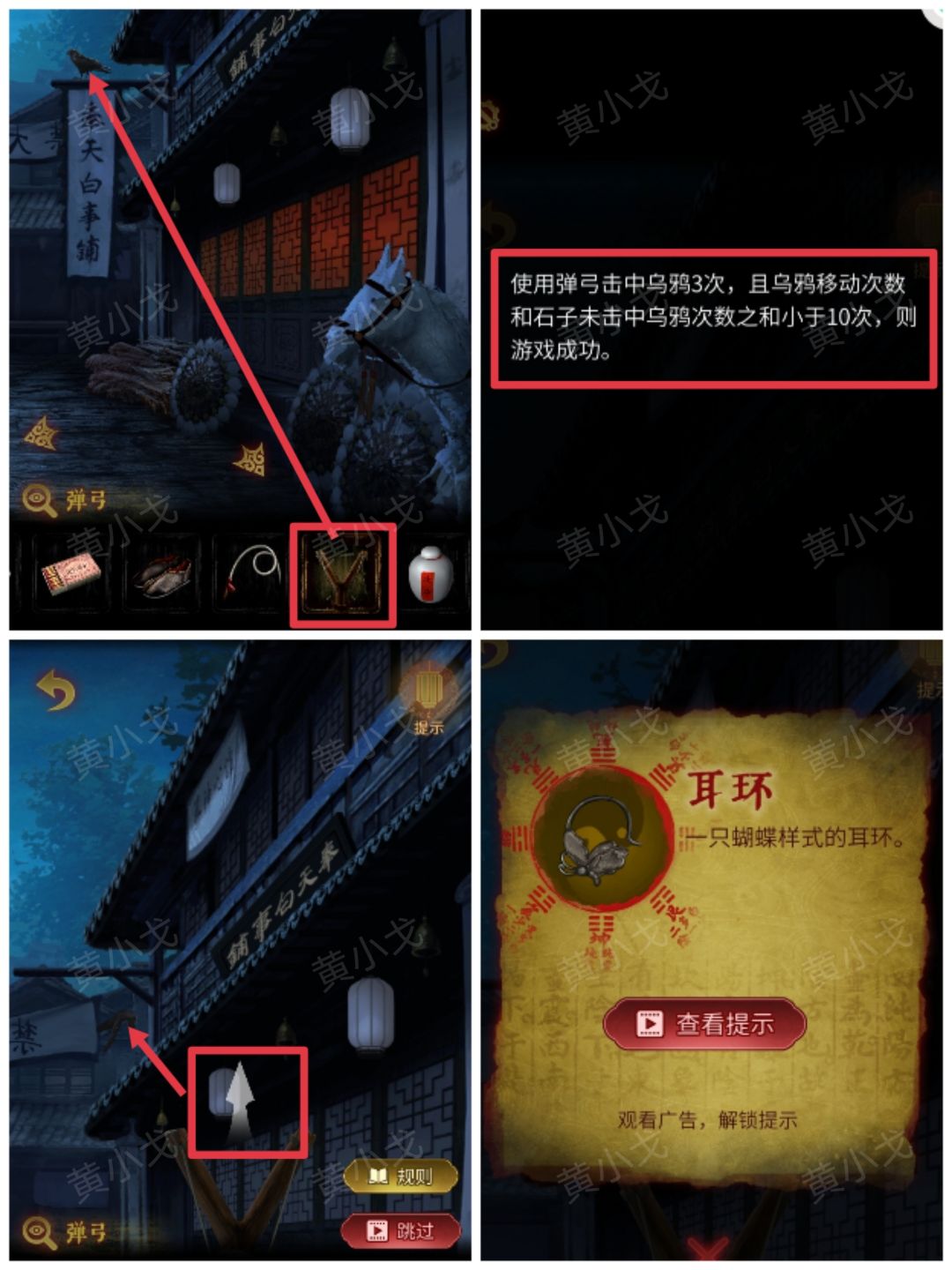 14.(铺子外)对树枝上的乌鸦使用【弹弓】,查看游戏说明,完成小游戏,获得【耳环】