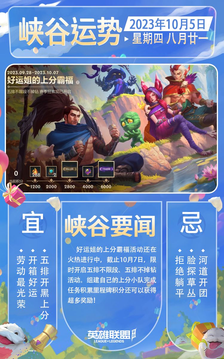 好运姐的上分霸福火热开启中!召唤师记得组建战力小队,一起享受五排不限段不掉钻的赛季狂欢吧,还可以累计积分获得稀有称号+奖励哦~