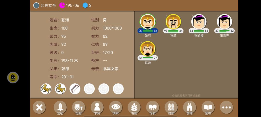 自定义君主三方面拉满生辰不用管性别选女,第二章群雄崛起大图叛乱寿命困难还是很有难度的,进去选公孙攒,君主换自定义的。为什么要选公孙瓒,因为它靠近中山和常山张合和赵云可以刷出来。刷出来后利用张合和君主成亲,可以刷出来武力9394959697这个档次的智力80多的完美武将,为什么不用赵云因为配的不强然后张合的寿命也很高。为什么不选刘备势力,虽然可以配出很强的但是会被曹操吊打,根本玩不下去。占领太原把君主和张郃放在那,因为太原可以买装备也可以粮钱互换而且也近,然后以太原为中心新配出来的武将前期两个的卢一个弓一个护镜就够了,先不要惹曹操。把能占的占完,到了中期有钱了可以再给所有武将加两把关刀,然后战斗的时候观察地方主将有没有钱,有钱就直接杀了,为什么不捉因为麻烦配出来的武将文武双全忠诚也很高,然后存点钱,把巨鹿攻下来,在巨鹿买水桶拖到太原去卖来回跑商赚差价。然后继续每个回合造一个,造出来了全副武装,常规的配置1装六个水桶放在中间234第一排的武将两个的卢两个帅印一个铁甲一个护镜56第二排的武将中间要夹一个水桶哥两个的卢一个弓两把关刀个护镜,第三排的三个人装五个帅印一个虎符。这就是大体思路了,原有的武将不要,因为开了叛乱,不想浪费钱刷忠诚最好不要,用用在你没有完全把守一个地方的时候就把里面的亡魂全部清理人口全部运跑武将能抄就抄。