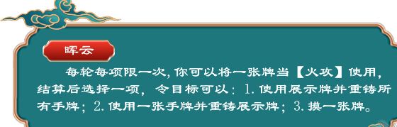 胡班的【晖云】技能是两段效果。效果一:把自己一张牌当【火攻】使用(并不限制次数,只要有牌就能发动,装备区的牌也可以),效果二:胡班可以在“重铸展示牌并使用一张手牌”“使用展示牌并重铸所有手牌”“摸一张牌”三个选项中选择一个让被【火攻】指定的人发动,但要注意技能说明中说的是“令目标可以”(即对方可以选择不发动这个选项)。无论对方是否发动以及发动是否成功,已经选过的选项本轮内不能再选。当选择“使用展示牌并重铸所有手牌”这个选项时,展示的牌必须是可以使用的牌,而且不能利用技能效果转化成其他牌使用(例如胡班对赵云发动【晖云】时,赵云展示的【闪】不能利用【龙胆】效果转化成【杀】使用)。如果该牌不能被直接使用(例如【闪】和【无懈可击】),则后续的“重铸所有手牌”效果不能发动。选择“重铸展示牌并使用一张手牌”时,所使用的手牌也不能是用技能效果转化的牌(参考上面赵云的例子)。【晖云】效果使用的牌不受回合内使用次数的限制,比如胡班对自己发动【晖云】并利用“重铸展示牌并使用一张手牌”“使用展示牌并重铸所有手牌”的效果各使用了一张【杀】,其回合内仍然可以再使用一次【杀】。