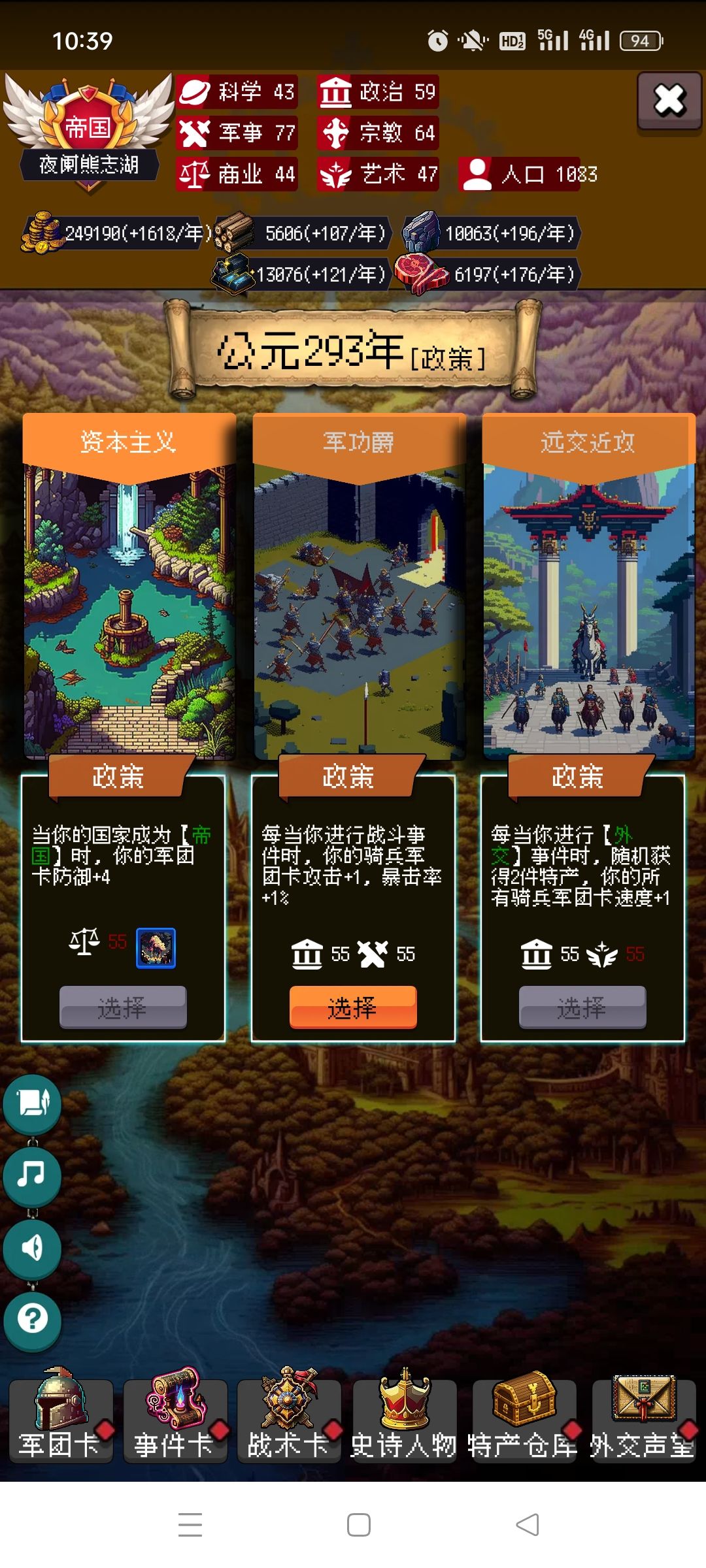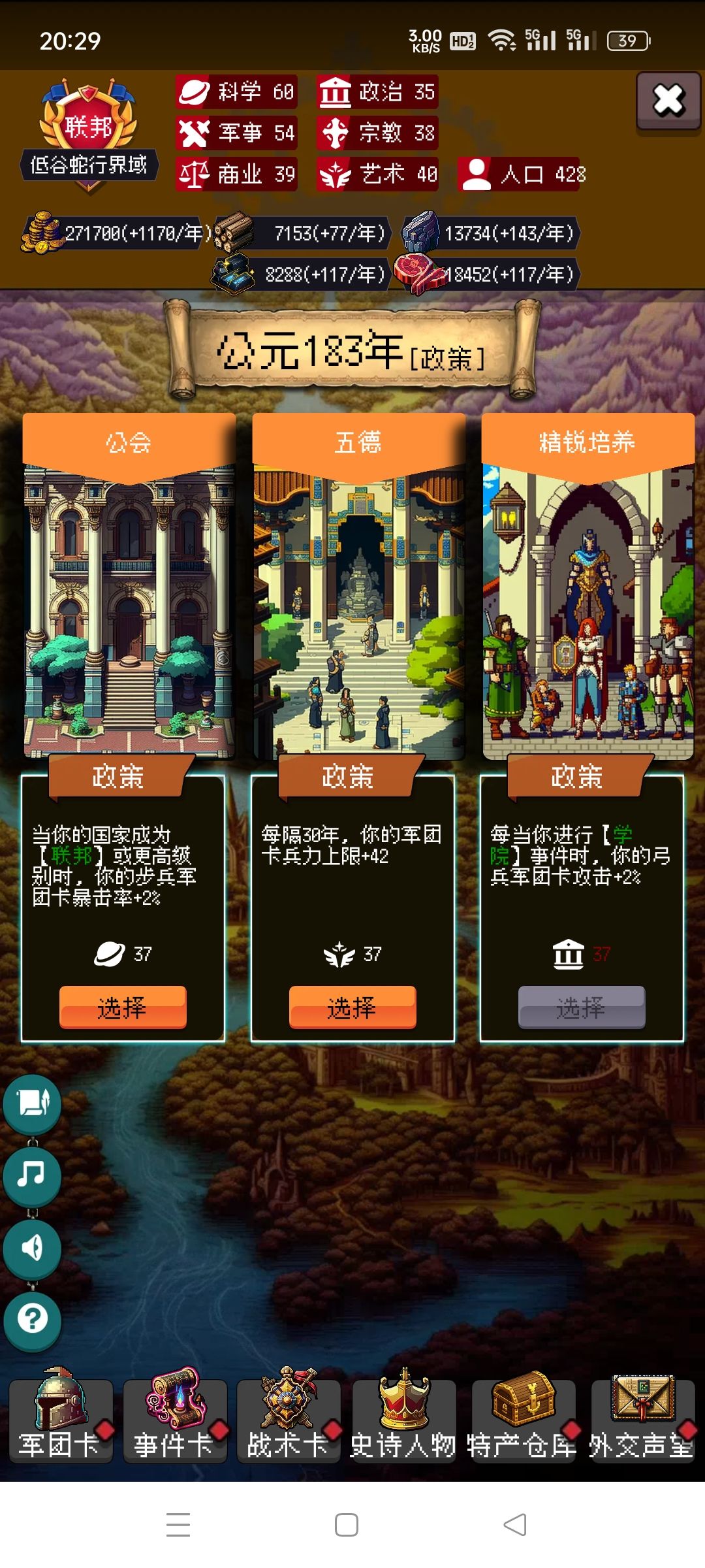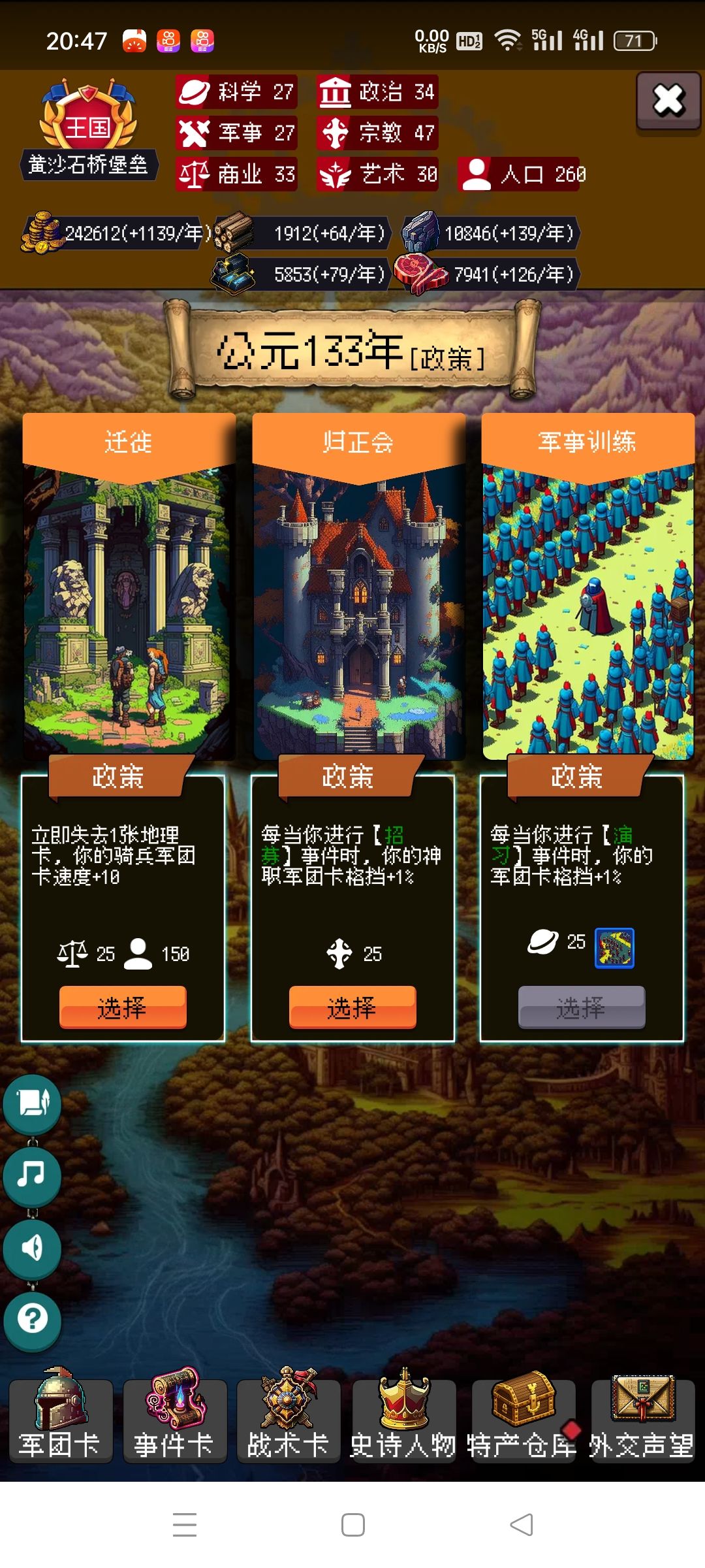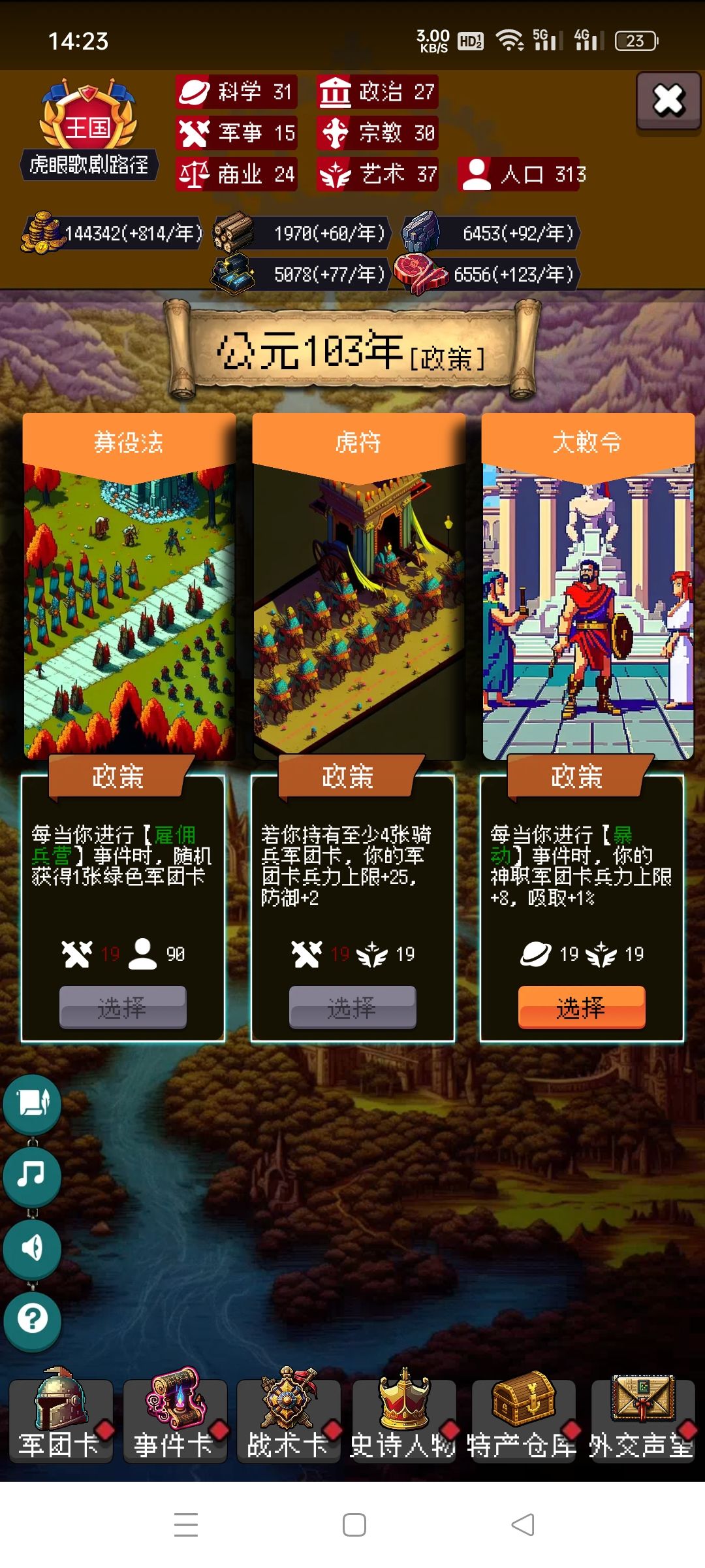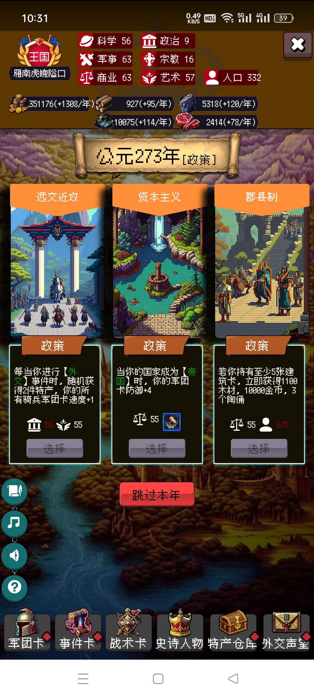 剩下的你靠自己吧,毕竟局里大部分都是随机,有好的政策点,速度攻击防御尽量多点骑兵的,没有选步兵。步兵主要是停战协议很肉。有不懂的可以问我。