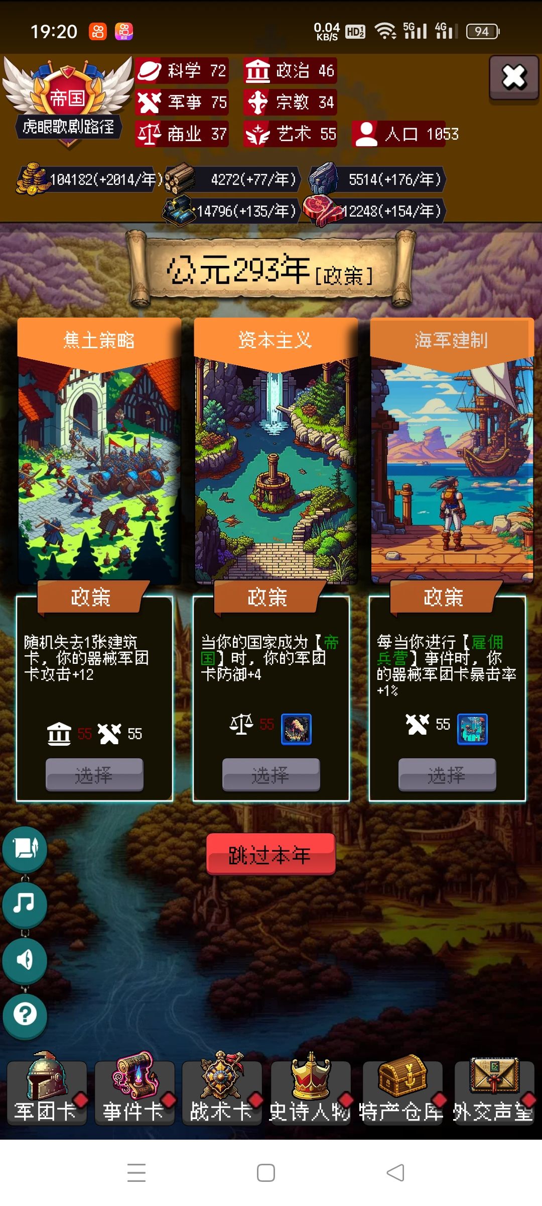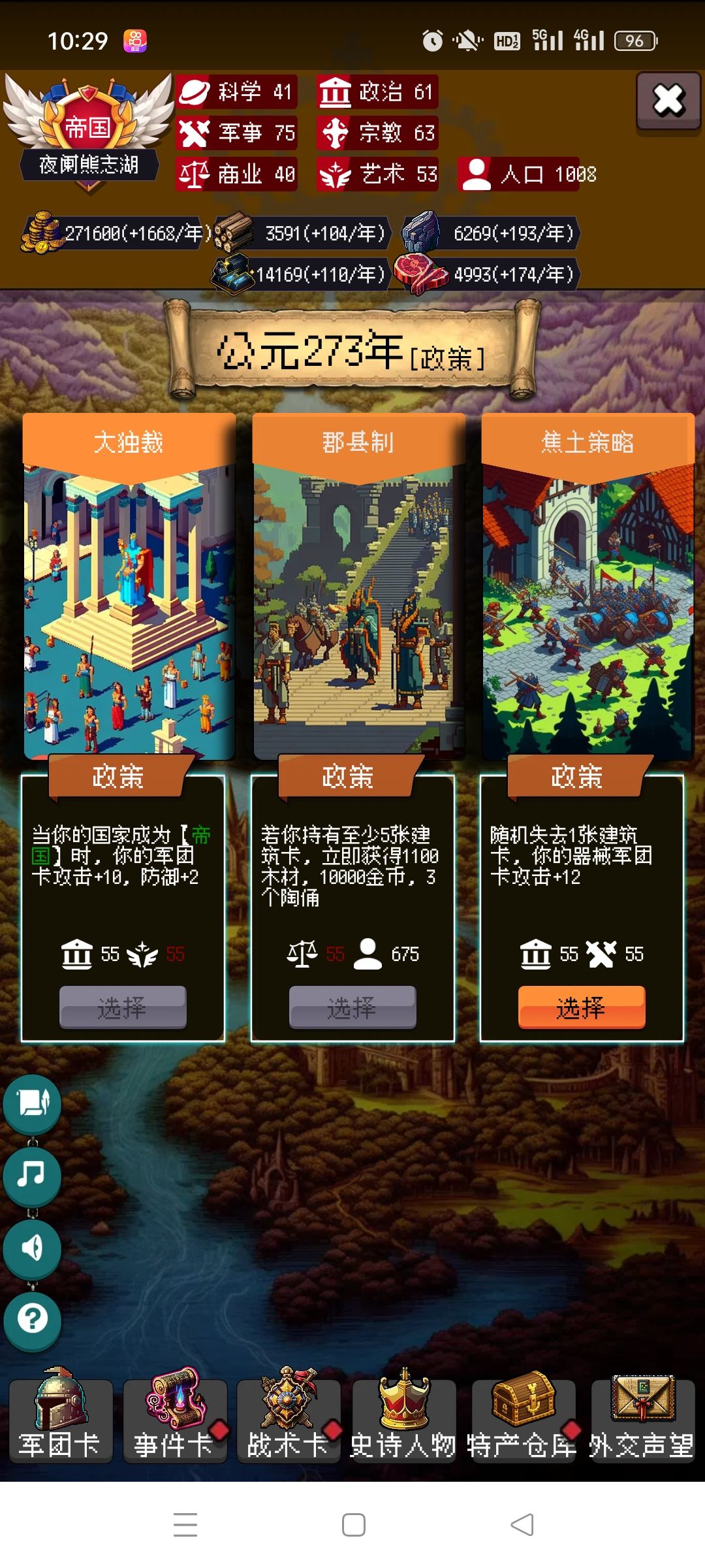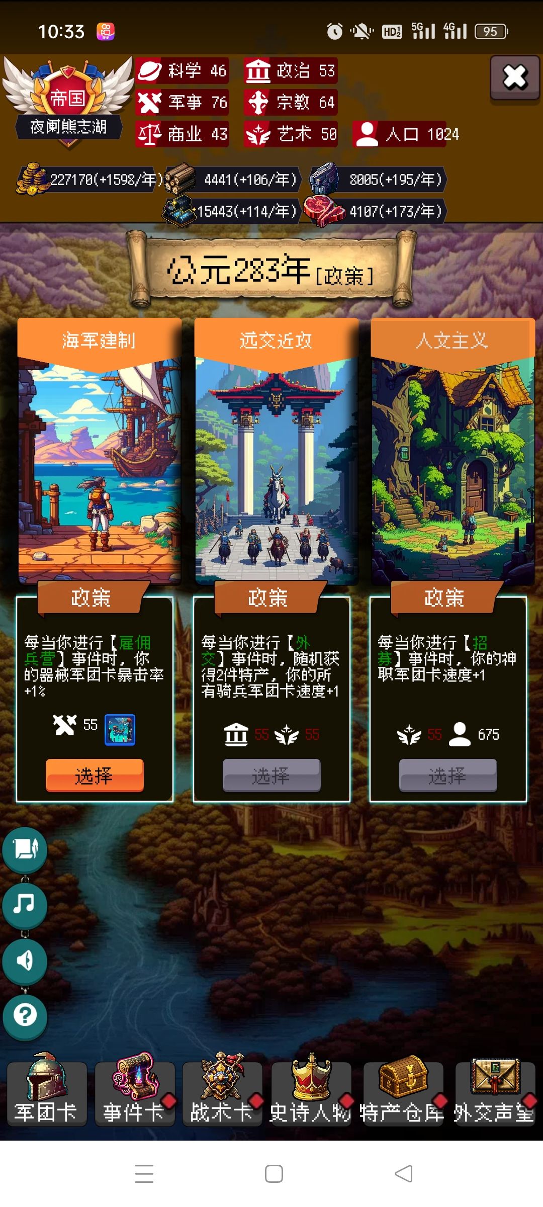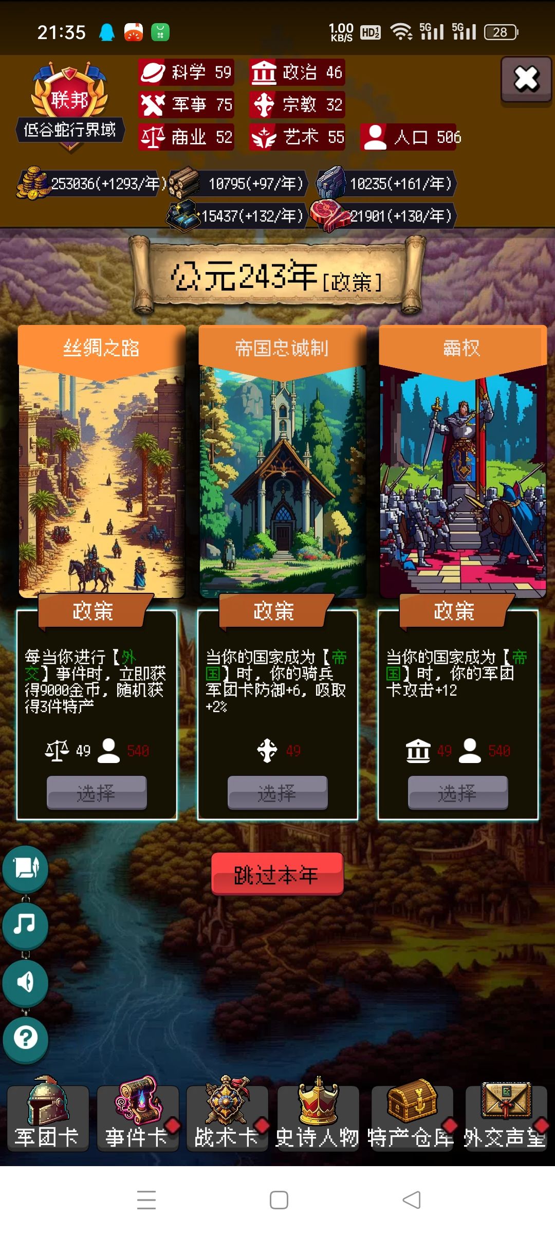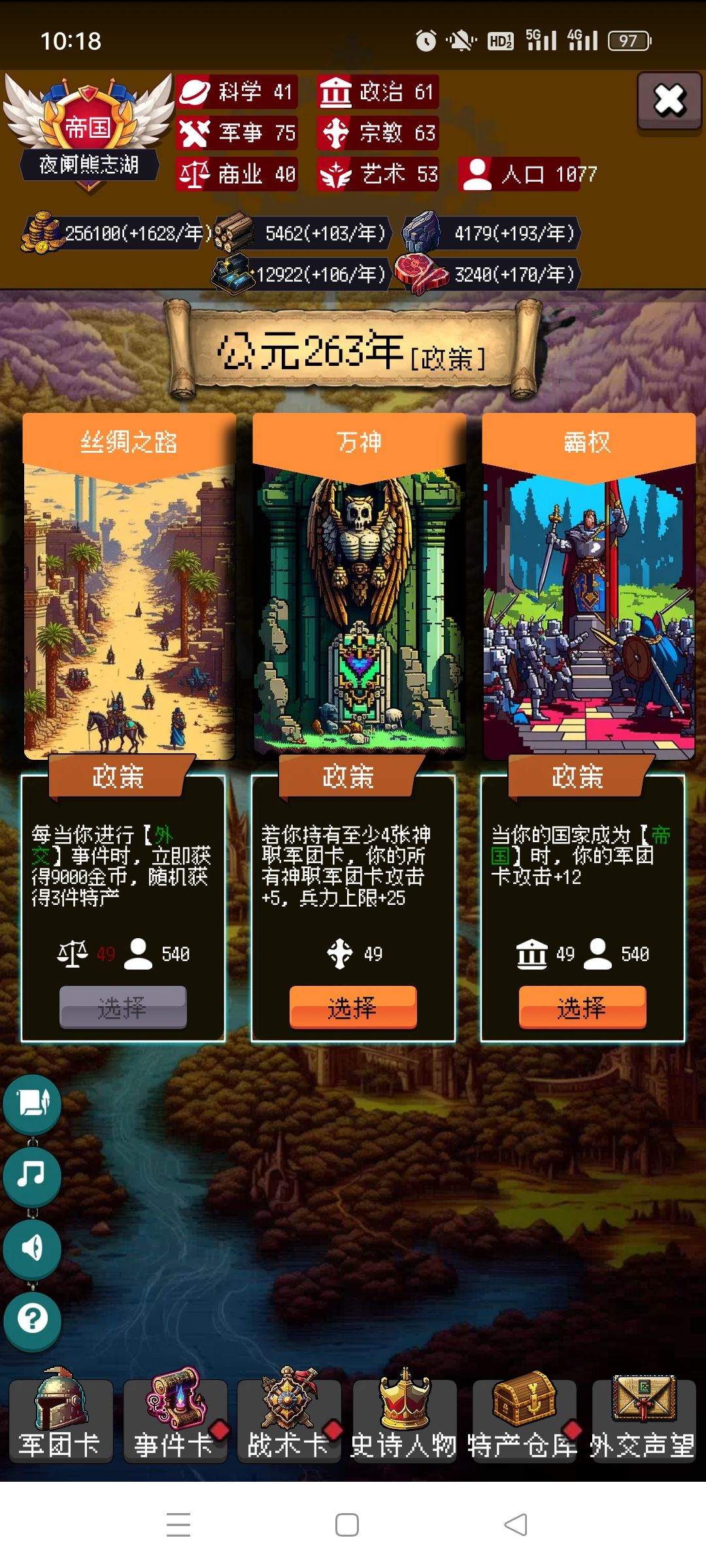 剩下的你靠自己吧,毕竟局里大部分都是随机,有好的政策点,速度攻击防御尽量多点骑兵的,没有选步兵。步兵主要是停战协议很肉。有不懂的可以问我。