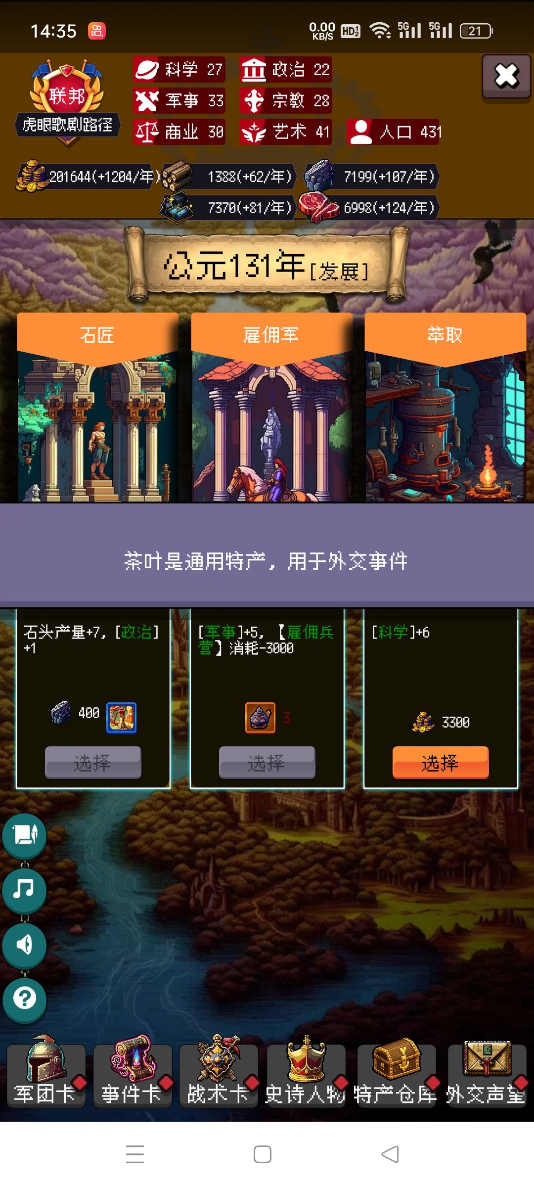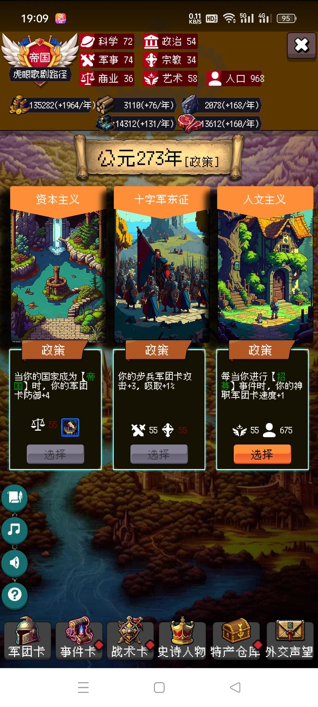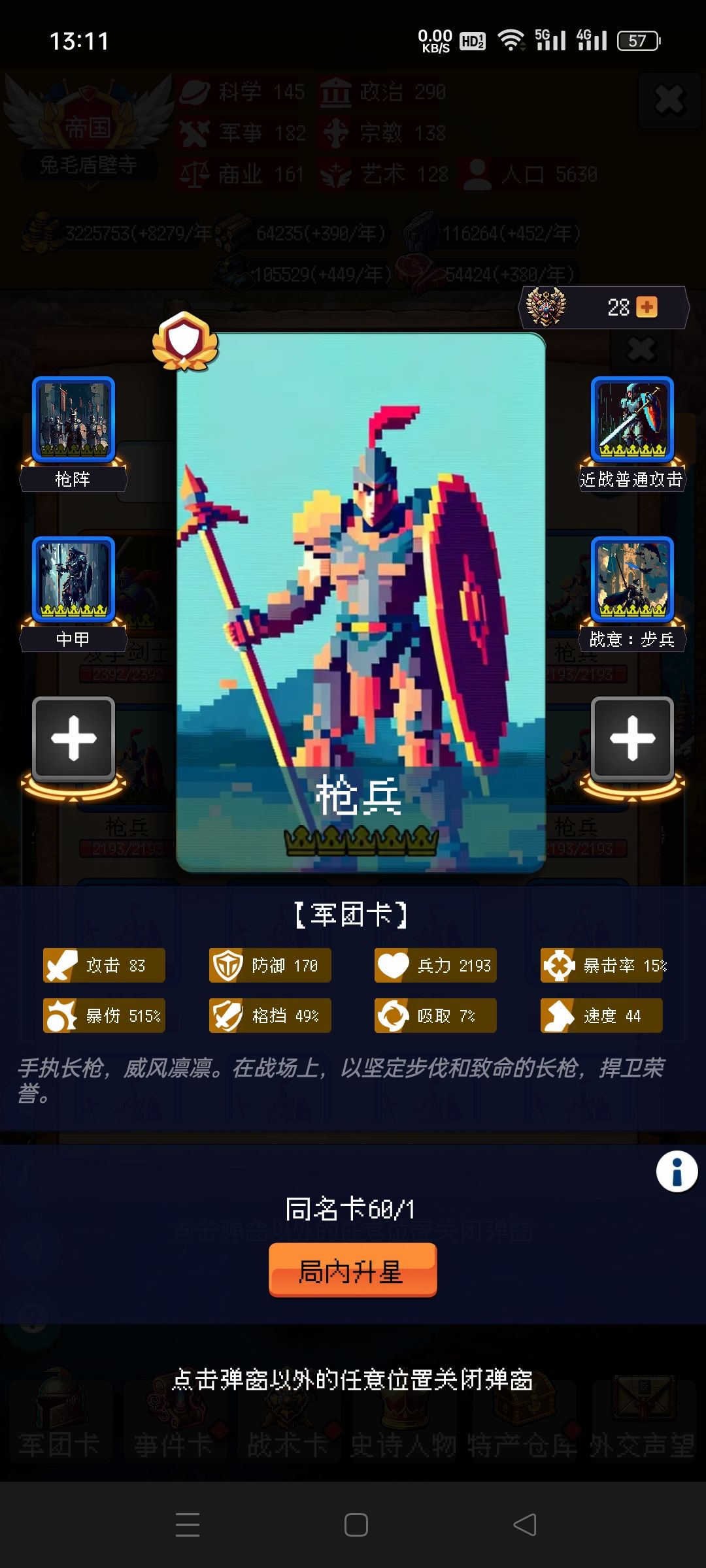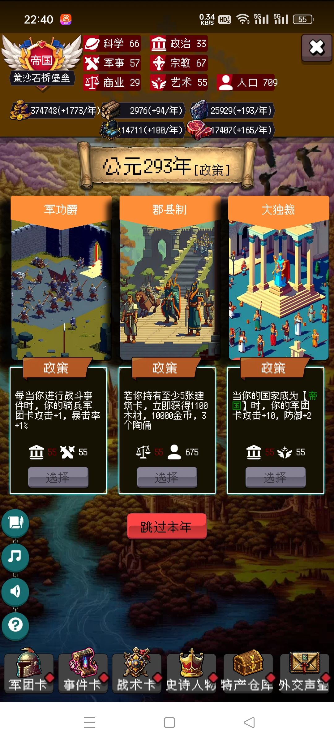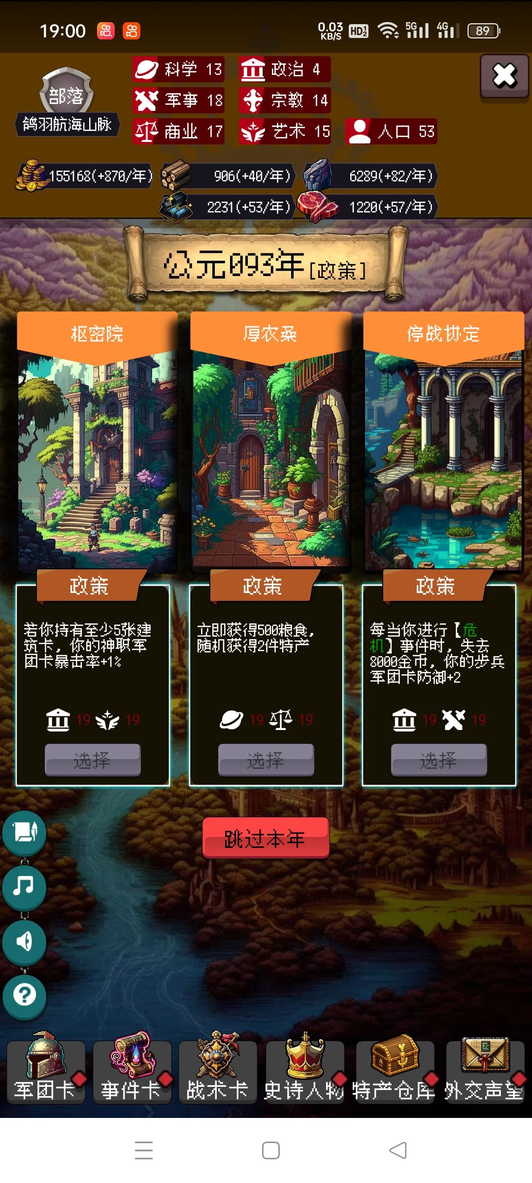 剩下的你靠自己吧,毕竟局里大部分都是随机,有好的政策点,速度攻击防御尽量多点骑兵的,没有选步兵。步兵主要是停战协议很肉。有不懂的可以问我。