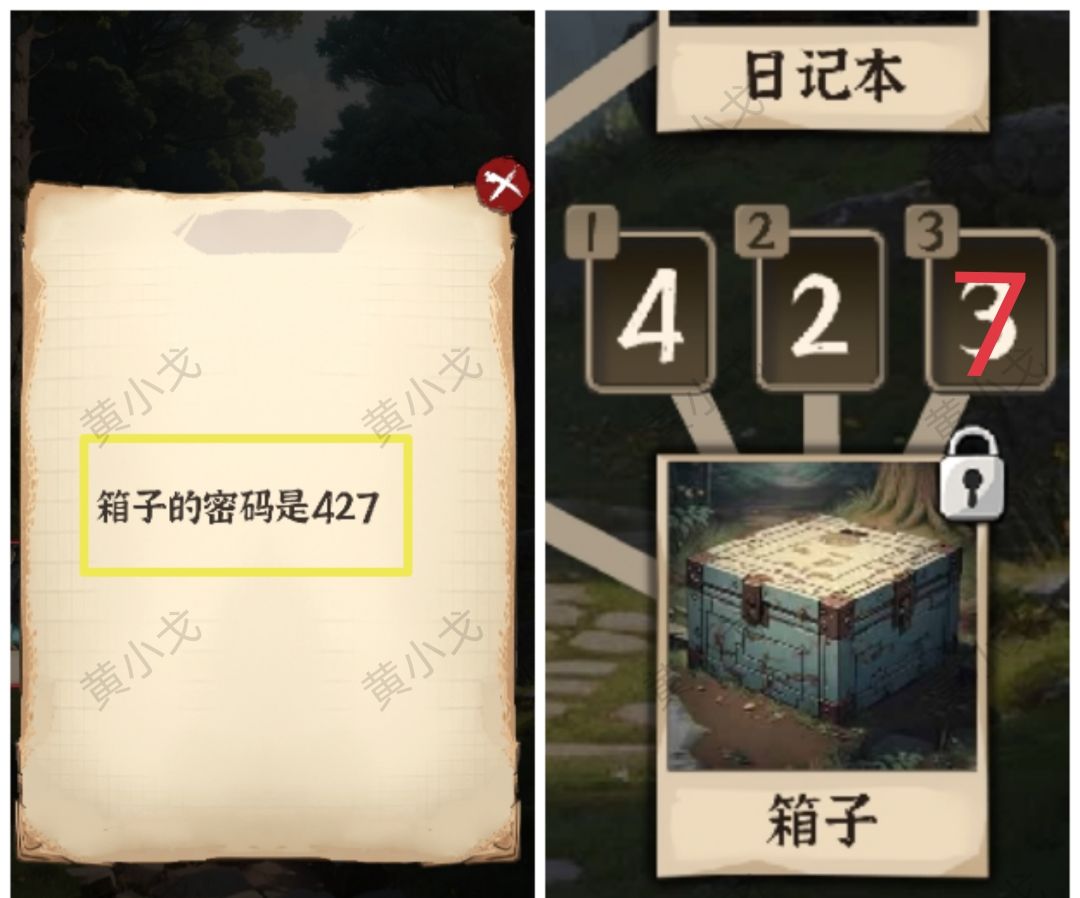 3.点击箱子,根据日记本上的线索,输入密码:427