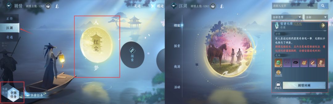 哈喽大家好,我们点击全部任务选择江湖-入红尘梦,在里面选择接受“智者无情”这个奇谋任务(任务流程比较长30分钟左右)