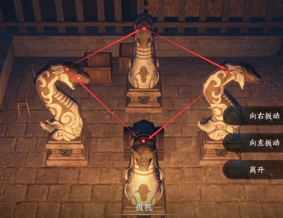 然后我们进入密道后需要将四座蛇石像的头全部向内即可完成解密