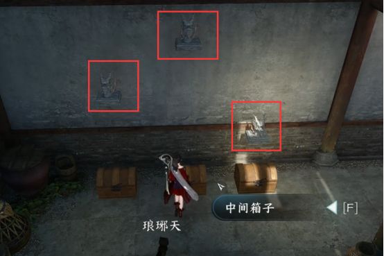 可以看到箱子后面的墙壁上有着三个石像,我们需要将其同步移动在最上方和最下方来打开箱子