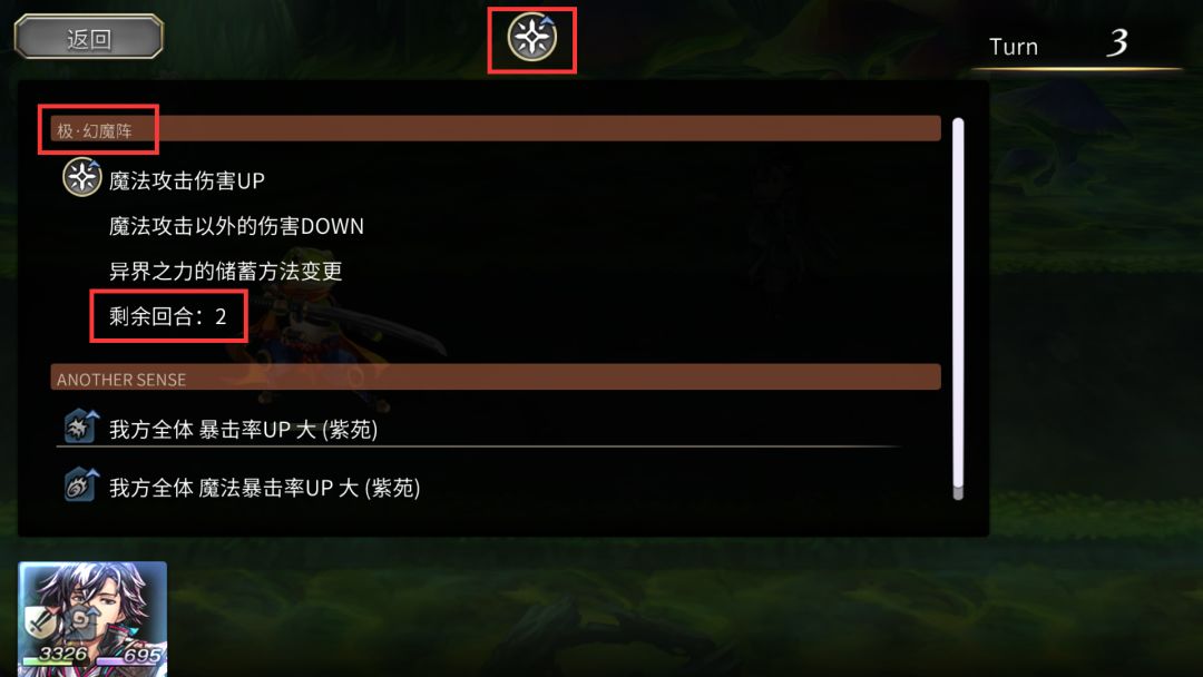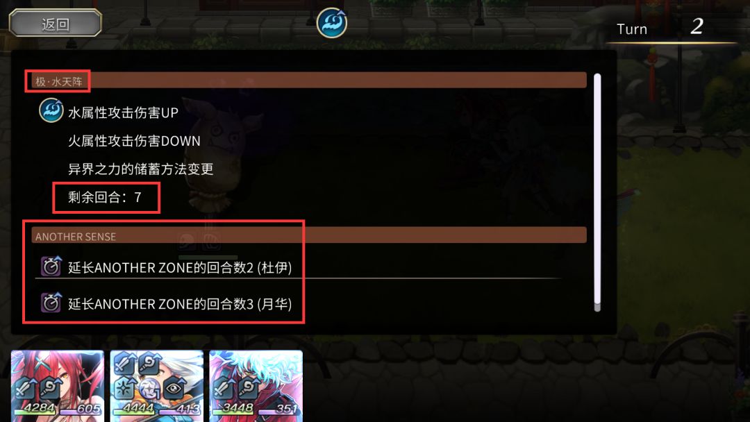 4.Another Sense: 上图中还显示了一栏BUFF叫Another Sense,这个东西叫做觉醒阵被动技能,每个异时层角色都有,当该角色在前排且可行动,有觉醒阵的情况自动触发,描述示例: