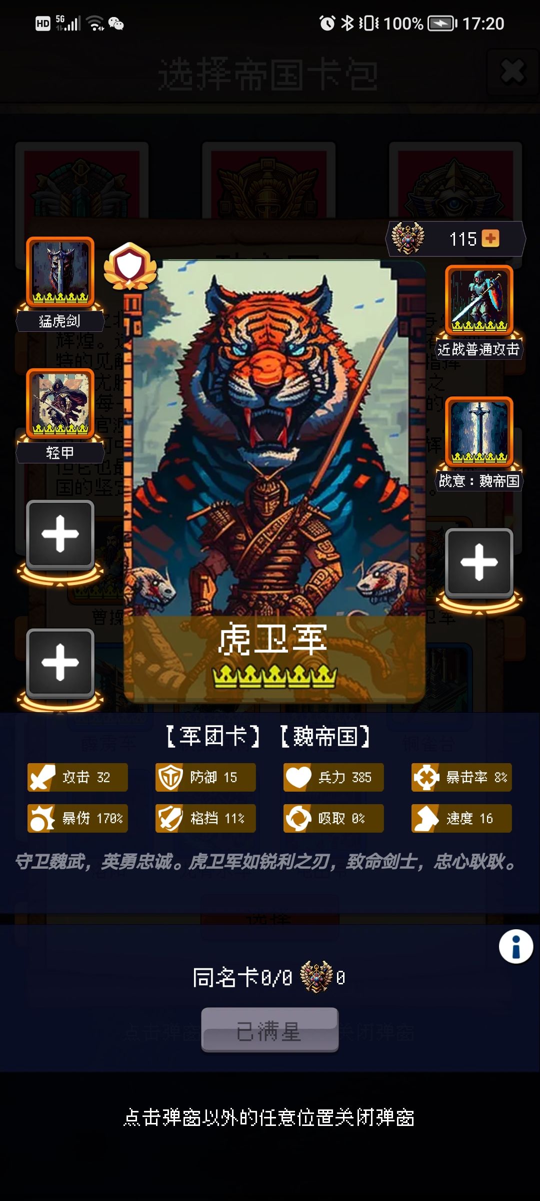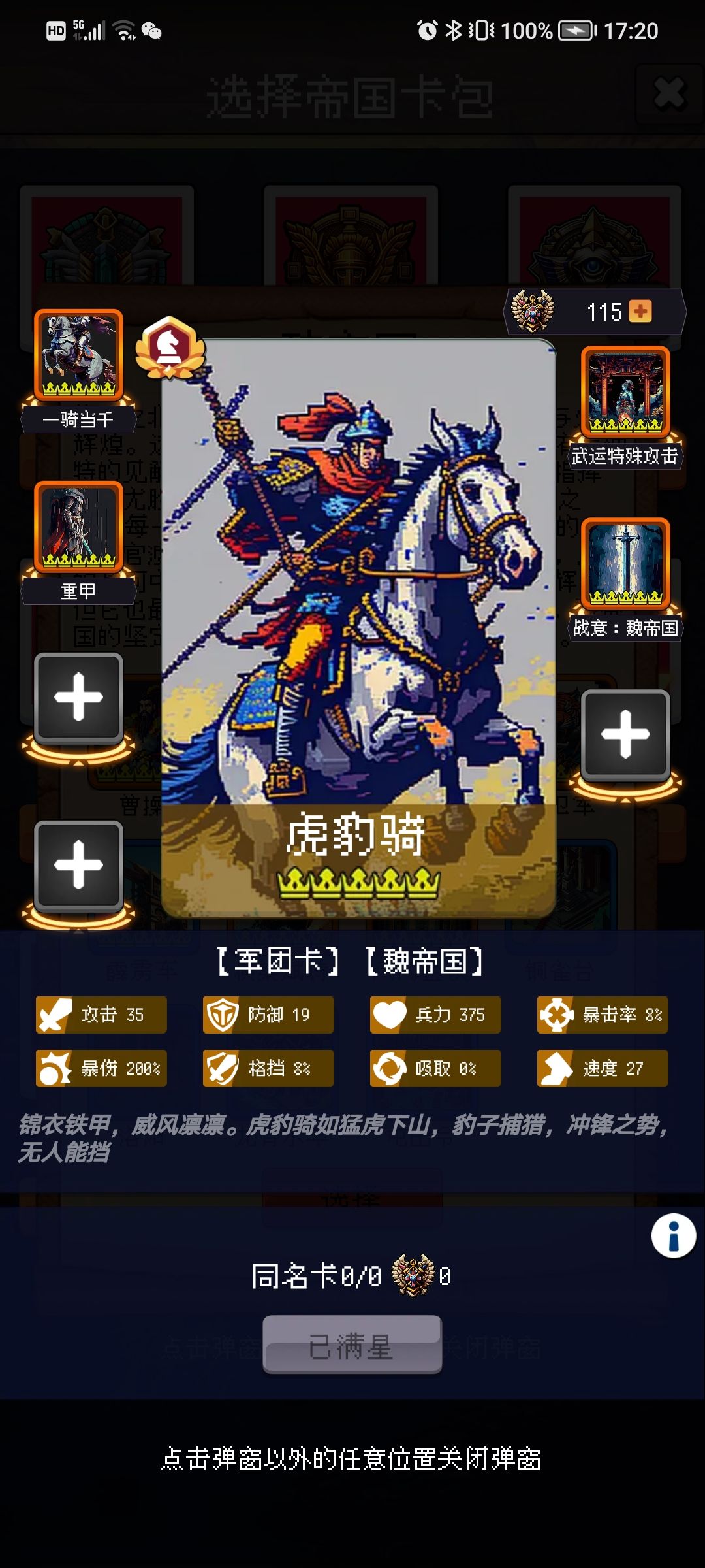 敌军:战斗力高、拖时间,两个虎卫是主c,类似于下地 龙骑士,有点恶心,就抗打硬格挡硬暴击(后期分别为50%、70%),核心在于虎豹骑,先把他打掉战斗力就锐减一半,如果是骑兵队建议带“胡狼围攻”免格挡。