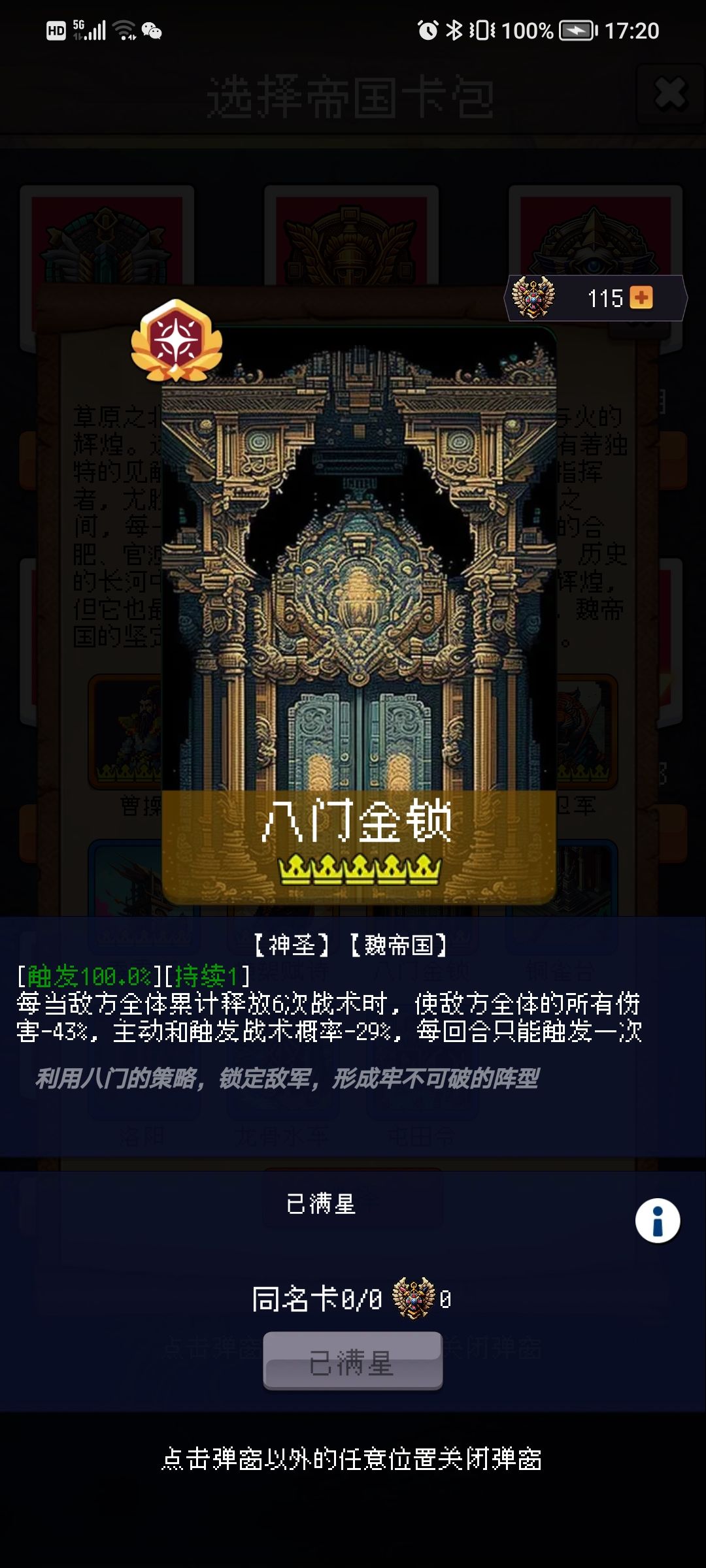 八门金锁:触发 100% 持续1,敌方累积释放6次战术后敌方全体伤害下降28%—40%、主动+触发战术概率下降17%—26%。商店可肝。