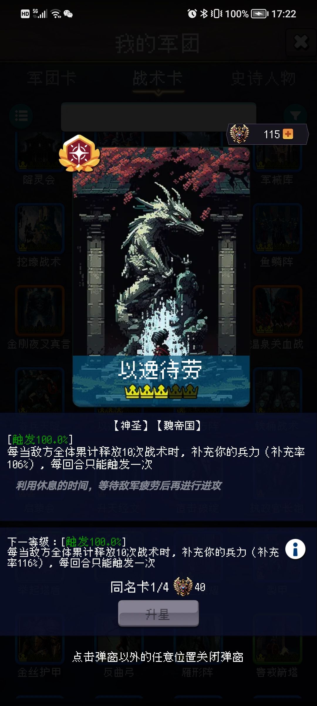 以逸待劳:触发 每回合限1次,敌方累积进行10次战术后获得77%—125%补充。商店可肝。