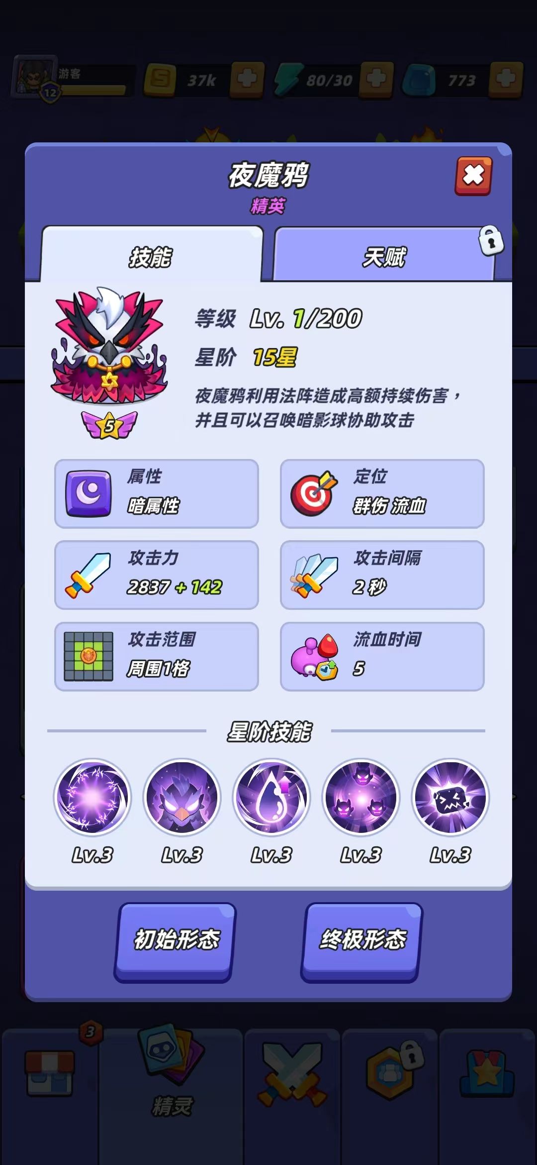夜魔鸦是暗属性的近战精灵,它的攻击范围大,解锁技能后能够造成高额的持续伤害,并且可以召唤暗影球协助攻击