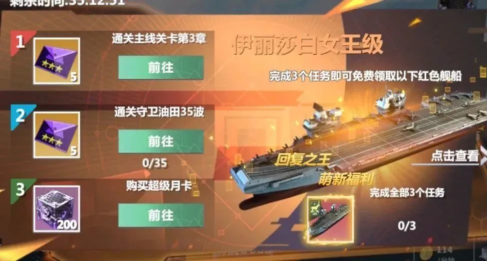 而且在新手期的【红船降临】活动中,完成3个对应任务,即可获取1艘伊丽莎白女王级舰船~