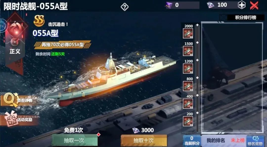 在【限时战舰】活动中,抽取055A的同时也可以获取到该配队其他船只;积分上榜更是可以获取055A专属舰长碎片和红1星全能模包!!