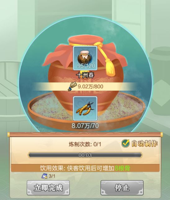 8.购买豪侠特权或累计签到6天可解锁自动制药,在线时可自动制药,离线时有自动制药的时间上限,提升尊享等级可增加离线自动制药的时间上限。