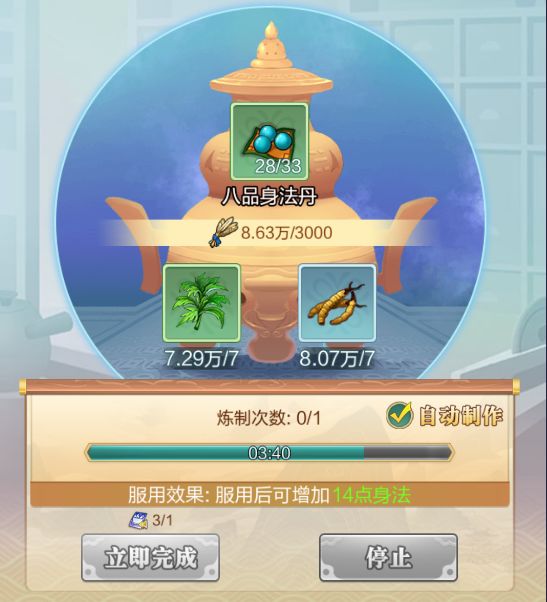 6.服用丹药可获得对应属性加成,存在每日服用次数,总服用上限。