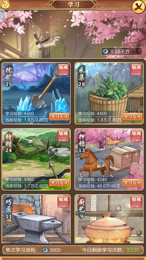每次学习所获得的经验,可以通过提高生活属性加成提高,明细可点击“加成”查看”。