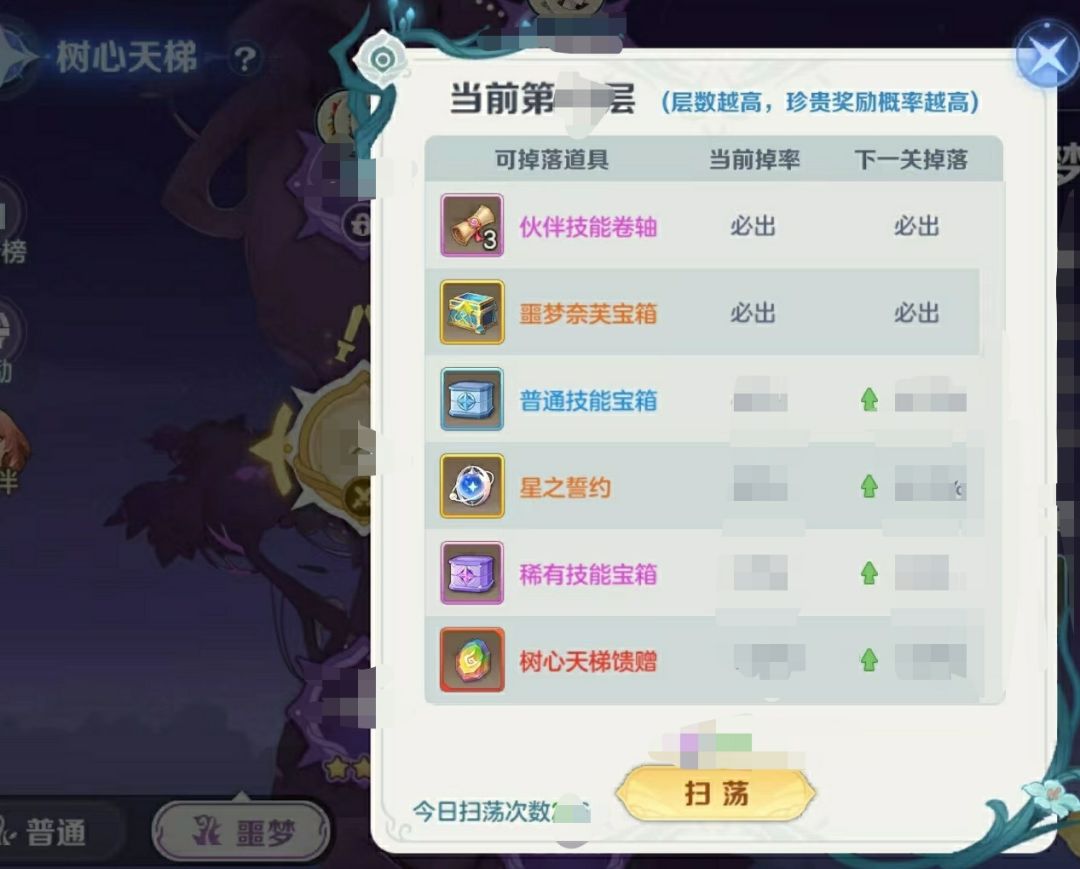 首先噩梦树心天梯是在普通树心天梯闯关达到18层以后开启挑战。噩梦树心天梯根据关卡可以携带多个伙伴共同出战。扫荡主要获得【伙伴技能卷轴】、【噩梦奈芙宝箱】、【普通技能宝箱】、【星之契约】、【稀有技能宝箱】、【树心天梯馈赠】等伙伴类提升材料。