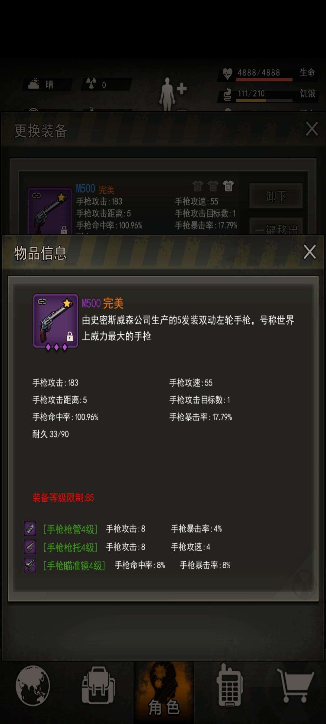 手枪的上限极高,技能输出极高,技能全命中全暴击,我估计能比同等的步枪(配件专精,宠物助战相同)快个10s。同样的,这基本也是堆一组料理也打不出来的,爆头不miss就不错了