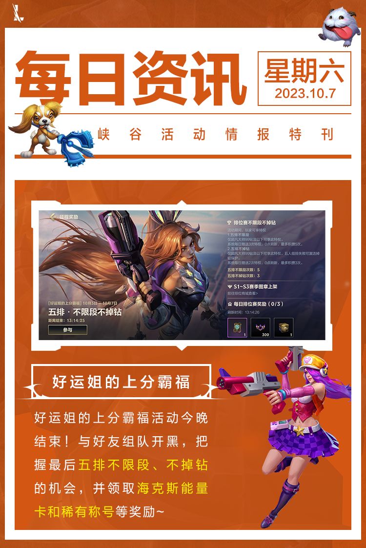 另外“好运姐的上分霸福”活动将在今晚结束,无论是五排不限段、不掉钻的宝贵机会,还是海克斯能量卡、稀有称号等奖励,今晚就是把握最后机会的时刻!
