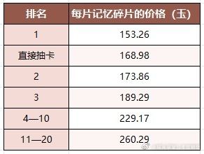 ▷一句话结论:只有排名达到第一名的情况下,性价比超过直接用【青鸾佩】抽卡,第二名开始性价比略低于直接抽卡,每个段位具体性价比详见图一(比较【每片记忆碎片的价格】,数字越小越划算)。