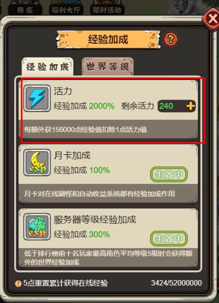游戏最核心的经验加成机制,每天送你60点活力,可以用石币购买120点活力(每天) ,在你有活力点的情况下你的经验倍数有20倍加成,简单讲就是你刷怪给了你1000经验,有活力的情况下会多出20000经验。